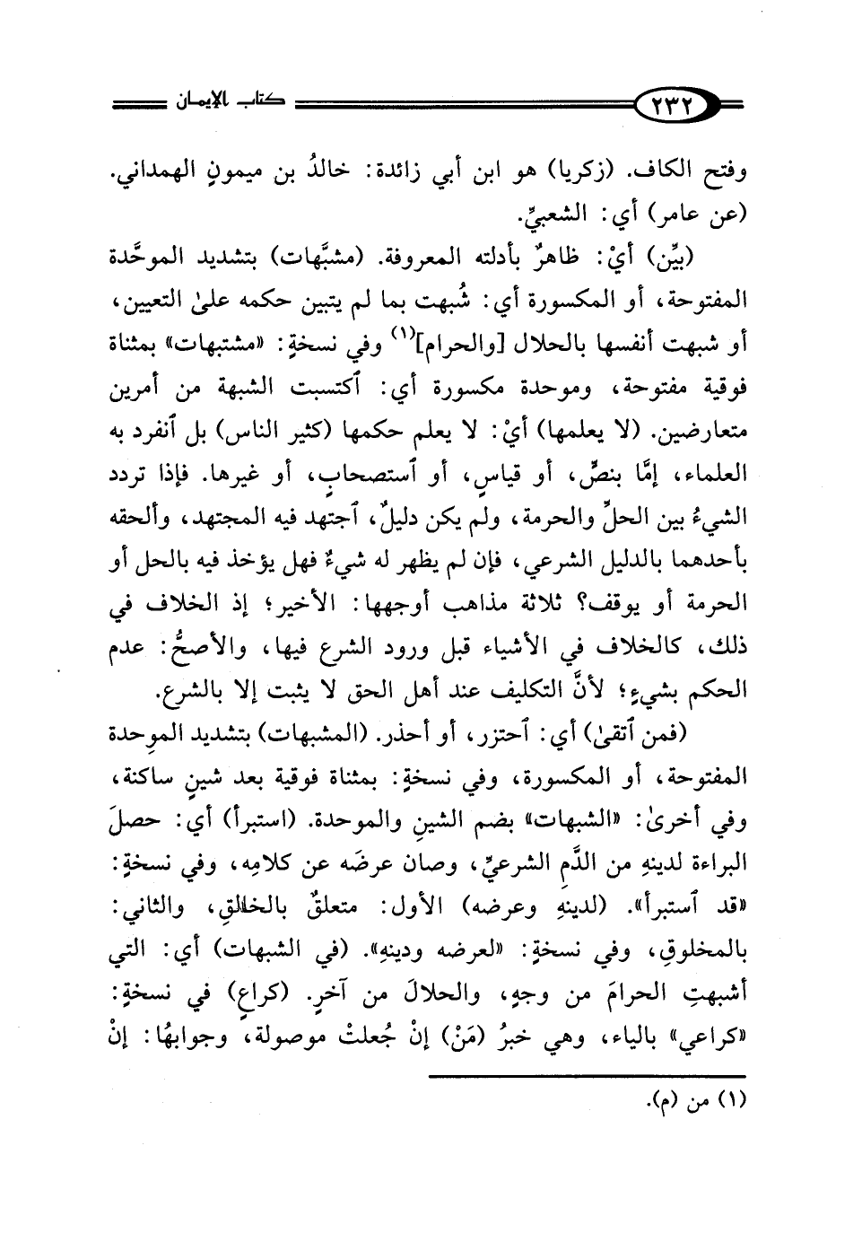 (بيَّن) أي: ظاهرٌ بأدلته المعروفة. (مشبَّهات) بتشديد الموحَّدة المفتوحة، أو المكسورة أي: شُبهت بما لم يتبين حكمه على التعيين، أو شبهت أنفسها بالحلال [والحرام] (¬1) وفي نسخةٍ: "مشتبهات" بمثناة فوقية مفتوحة، وموحدة مكسورة أي: أكتسبت الشبهة من أمرين متعارضين. (لا يعلمها) أي: لا يعلم حكمها (كثير النَّاس) بل انفرد به العلماء، إمَّا بنصٍّ، أو قياسٍ، أو استصحاب، أو غيرها. فإذا تردد الشيءُ بين الحلِّ والحرمة، ولم يكن دليلٌ، اجتهد فيه المجتهد، وألحقه بأحدهما بالدليل الشرعي، فإن لم يظهر له شيءٌ فهل يؤخذ فيه بالحل أو الحرمة أو يوقف؟ ثلاثة مذاهب أوجهها: الأخير؛ إذ الخلاف في ذلك، كالخلاف في الأشياء قبل ورود الشرع فيها، والأصحُّ: عدم الحكم بشيءٍ؛ لأنَّ التكليف عند أهل الحق لا يثبت إلا بالشرع.