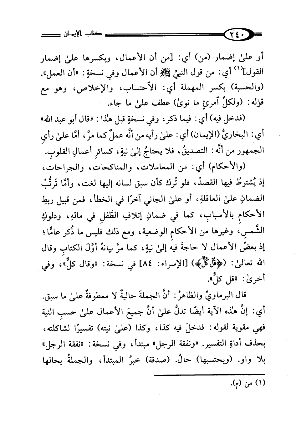 قال البرماويُّ والظاهرُ: أنَّ الجملةَ حالية لا معطوفةٌ على ما سبق. أي: إنَّ هذه الآية أيضًا تدل على أنَّ جميعَ الأعمال على حسبِ النية فهي مقوية لقوله: فدخلَ فيه كذا، وكذا (على نيته) تفسيرًا لشاكلته، بحذف أداةِ التفسير. "ونفقة الرجل" مبتدأ، وفي نسخة: "نفقة الرجل" بلا واو. (ويحتسبها) حالٌ. (صدقة) خبرُ المبتدأ، والجملةُ بحالها