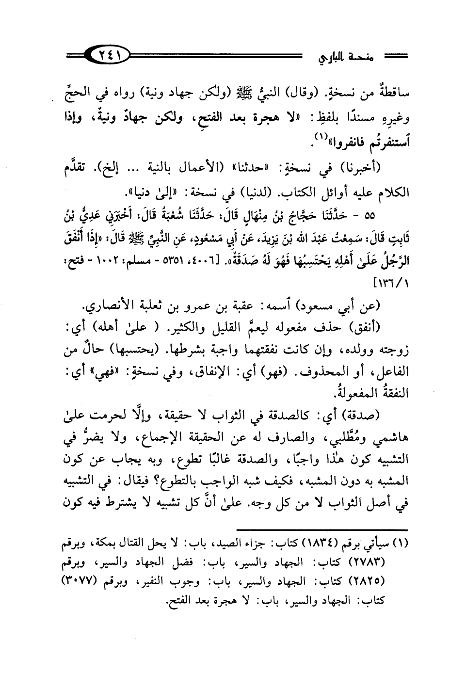 ساقطةٌ من نسخةٍ. (وقال) النَّبيُّ - صَلَّى الله عليه وسلم - (ولكن جهاد ونية) رواه في الحجِّ وغيرِهِ مسندًا بلفظِ: "لا هجرة بعد الفتحِ، ولكن جهادٌ ونيةٌ، وإذا أستنفرتُم فانفروا" (¬1).