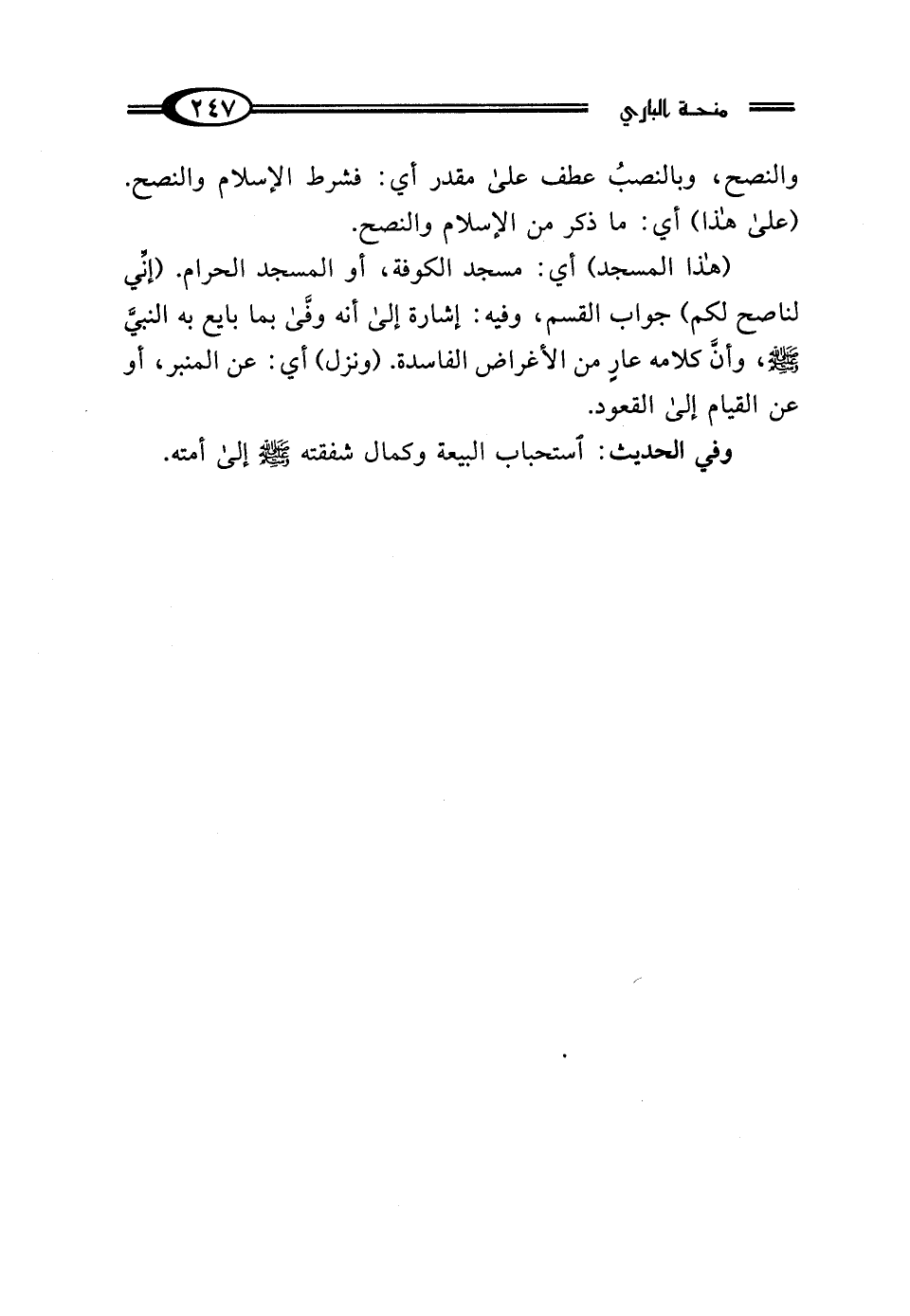 (هذا المسجد) أي: مسجد الكوفة، أو المسجد الحرام. (إنِّي لناصح لكم) جواب القسم، وفيه: إشارة إلى أنه وفَّى بما بايع به النَّبيُّ - صلى الله عليه وسلم -، وأنَّ كلامه عارِ من الأغراض الفاسدة. (ونزل) أي: عن المنبر، أو عن القيام إلى القعود.