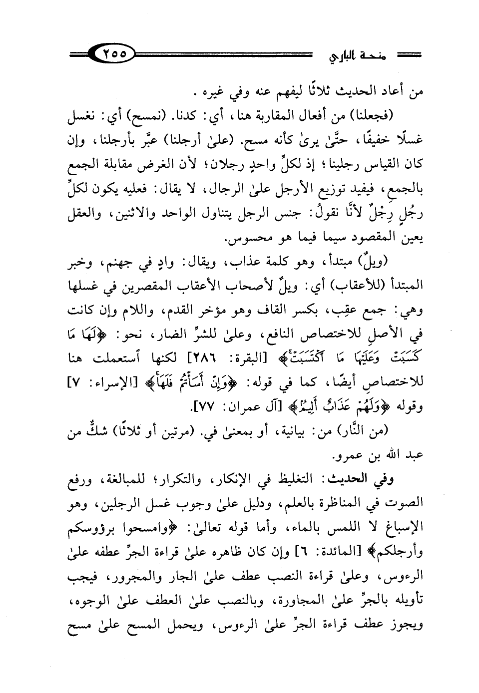 وفي الحديث: التغليظ في الإنكار، والتكرارة للمبالغة، ورفع الصوت في المناظرة بالعلم، ودليل على وجوب غسل الرجلين، وهو الإسباغ لا اللمس بالماء، وأما قوله تعالى: {وامسحوا برؤوسكم وأرجلكم} [المائدة: 6] وإن كان ظاهره على قراءة الجرِّ عطفه على الرءوس، وعلى قراءة النصب عطف على الجار والمجرور، فيجب تأويله بالجرِّ على المجاورة، وبالنصب على العطف على الوجوه، ويجوز عطف قراءة الجز على الرءوس، ويحمل المسح على مسح