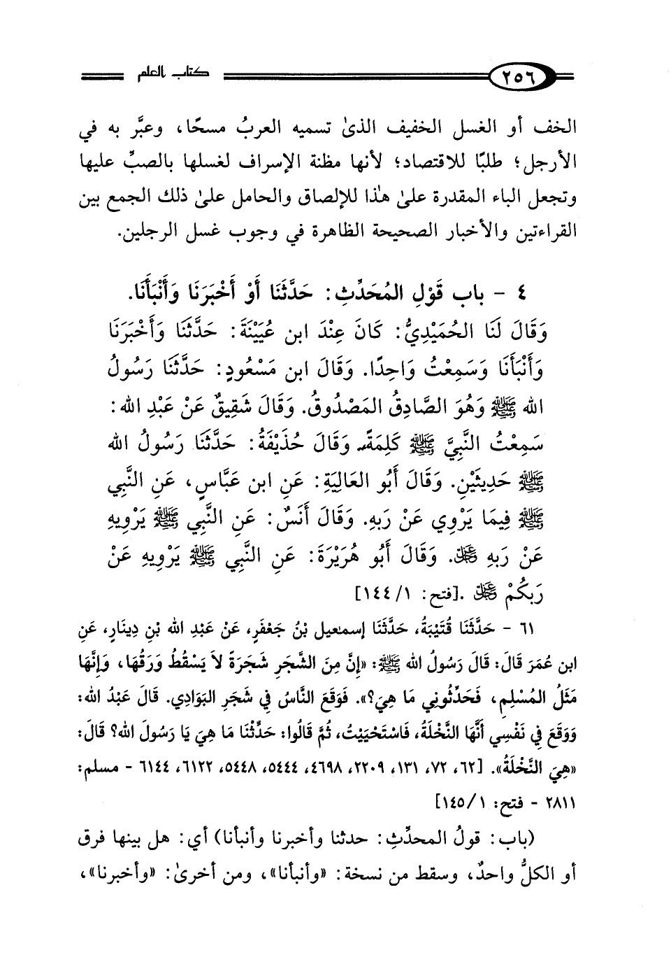 وَقَالَ لَنَا الحُمَيْدِيُّ: "كَانَ عِنْدَ ابْنِ عُيَيْنَةَ حَدَّثَنَا، وَأَخْبَرَنَا، وَأَنْبَأَنَا، وَسَمِعْتُ وَاحِدًا وَقَالَ ابْنُ مَسْعُودٍ: حَدَّثَنَا رَسُولُ اللَّهِ صَلَّى اللهُ عَلَيْهِ وَسَلَّمَ وَهُوَ الصَّادِقُ المَصْدُوقُ وَقَالَ شَقِيقٌ: عَنْ عَبْدِ اللَّهِ سَمِعْتُ النَّبِيَّ صَلَّى اللهُ عَلَيْهِ وَسَلَّمَ كَلِمَةً وَقَالَ حُذَيْفَةُ حَدَّثَنَا رَسُولُ اللَّهِ صَلَّى اللهُ عَلَيْهِ وَسَلَّمَ حَدِيثَيْنِ وَقَالَ أَبُو العَالِيَةِ عَنْ ابْنِ عَبَّاسٍ عَنِ النَّبِيِّ صَلَّى اللهُ عَلَيْهِ وَسَلَّمَ: فِيمَا يَرْوي عَنْ رَبِّهِ وَقَالَ أَنَسٌ عَنِ النَّبِيِّ صَلَّى اللهُ عَلَيْهِ وَسَلَّمَ: فِيمَا يَرْويهِ عَنْ رَبِّهِ عَزَّ وَجَلَّ وَقَالَ أَبُو هُرَيْرَةَ عَنِ النَّبِيِّ صَلَّى اللهُ عَلَيْهِ وَسَلَّمَ: يَرْويهِ عَنْ رَبِّكُمْ عَزَّ وَجَلَّ.