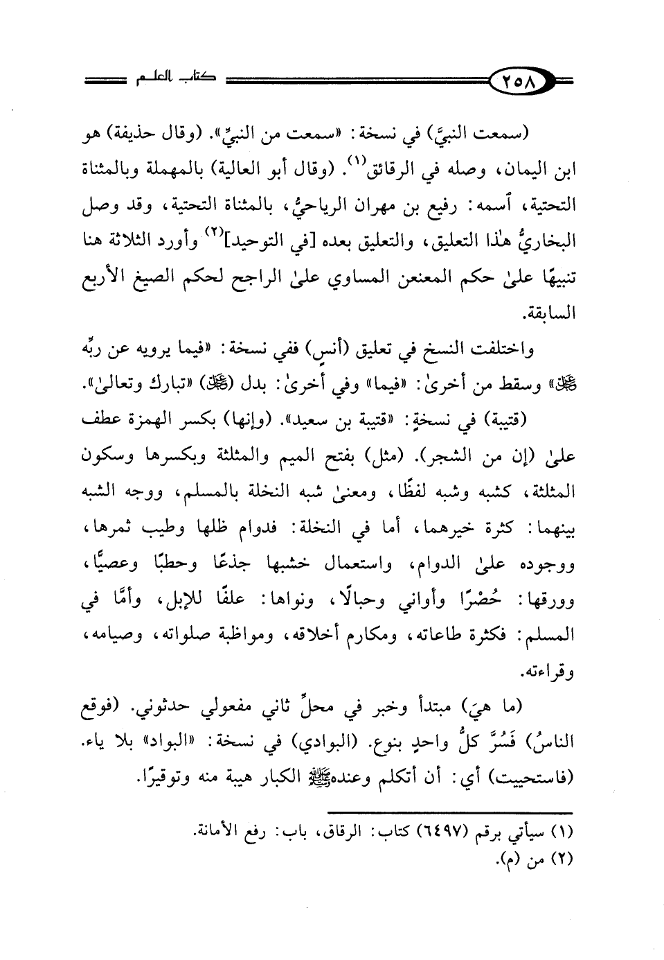 (سمعت النبيَّ) في نسخة: "سمعت من النبيِّ". (وقال حذيفة) هو ابن اليمان، وصله في الرقائق (¬1). (وقال أبو العالية) بالمهملة وبالمثناة التحتية، اسمه: رفيع بن مهران الرياحيُّ، بالمثناة التحتية، وقد وصل البخاريُّ هذا التعليق، والتعليق بعده [في التوحيد] (¬2) وأورد الثلاثة هنا تنبيهًا على حكم المعنعن المساوي على الراجح لحكم الصيغ الأربع السابقة.
