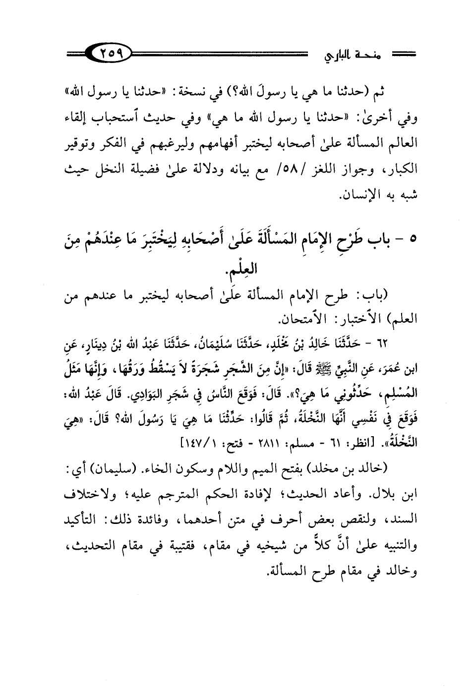 5 - بَابُ طَرْحِ الإِمَامِ المَسْأَلَةَ عَلَى أَصْحَابِهِ لِيَخْتَبِرَ مَا عِنْدَهُمْ مِنَ العِلْمِ.