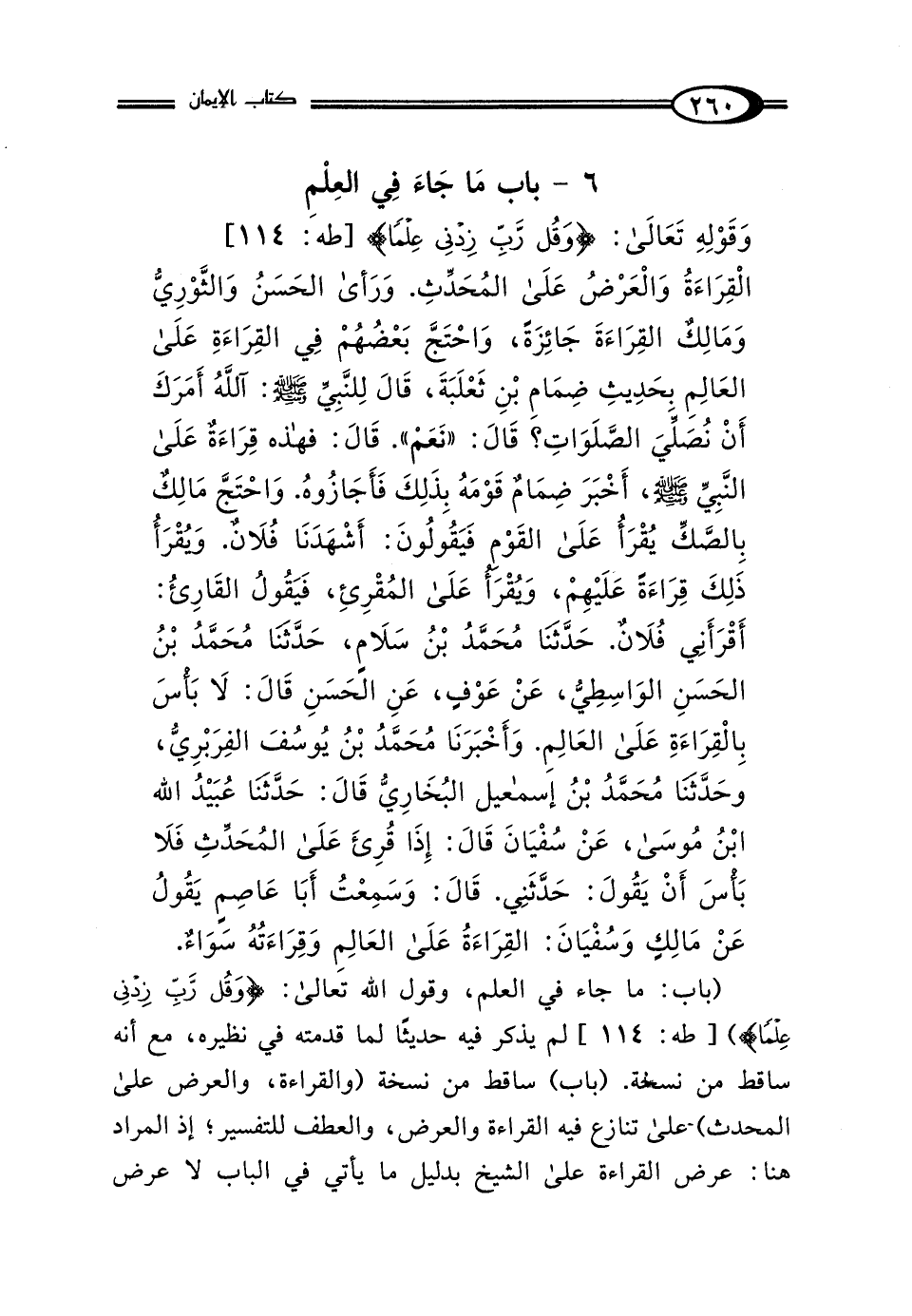 القِرَاءَةُ وَالعَرْضُ عَلَى المُحَدِّثِ وَرَأَى الحَسَنُ، وَالثَّوْرِيُّ، وَمَالِكٌ: «القِرَاءَةَ جَائِزَةً» وَاحْتَجَّ بَعْضُهُمْ فِي القِرَاءَةِ عَلَى العَالِمِ " بِحَدِيثِ ضِمَامِ بْنِ ثَعْلَبَةَ: قَالَ لِلنَّبِيِّ صَلَّى اللهُ عَلَيْهِ وَسَلَّمَ: آللَّهُ أَمَرَكَ أَنْ تُصَلِّيَ الصَّلَوَاتِ قَالَ: «نَعَمْ» قَالَ: «فَهَذِهِ قِرَاءَةٌ عَلَى النَّبِيِّ صَلَّى اللهُ عَلَيْهِ وَسَلَّمَ أَخْبَرَ ضِمَامٌ قَوْمَهُ بِذَلِكَ فَأَجَازُوهُ» وَاحْتَجَّ مَالِكٌ: " بِالصَّكِّ يُقْرَأُ عَلَى القَوْمِ، فَيَقُولُونَ أَشْهَدَنَا فُلاَنٌ وَيُقْرَأُ ذَلِكَ قِرَاءَةً عَلَيْهِمْ وَيُقْرَأُ عَلَى المُقْرِئِ، فَيَقُولُ القَارِئُ: أَقْرَأَنِي فُلاَنٌ " حَدَّثَنَا مُحَمَّدُ بْنُ سَلاَمٍ، حَدَّثَنَا مُحَمَّدُ بْنُ الحَسَنِ الوَاسِطِيُّ، عَنْ عَوْفٍ، عَنِ الحَسَنِ، قَالَ: «لاَ بَأْسَ بِالقِرَاءَةِ عَلَى العَالِمِ» وَأَخْبَرَنَا مُحَمَّدُ بْنُ يُوسُفَ الفَرَبْرِيُّ، وَحَدَّثَنَا مُحَمَّدُ بْنُ إِسْمَاعِيلَ البُخَارِيُّ قَالَ: حَدَّثَنَا عُبَيْدُ اللَّهِ بْنُ مُوسَى عَنْ سُفْيَانَ قَالَ: إِذَا قُرِئَ عَلَى المُحَدِّثِ فَلاَ بَأْسَ أَنْ يَقُولَ: حَدَّثَنِي قَالَ: وَسَمِعْتُ أَبَا عَاصِمٍ يَقُولُ عَنْ مَالِكٍ، وَسُفْيَانَ القِرَاءَةُ عَلَى العَالِمِ وَقِرَاءَتُهُ سَوَاءٌ.