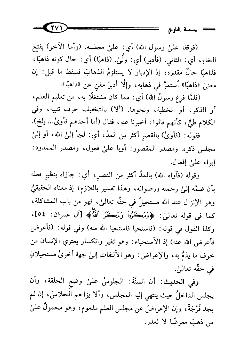 وقوله (فآواه الله) بالمدِّ أكثر من القصرِ، أي: جازاه بنظيرِ فعله بأن ضمَّه إلى رحمته ورضوانه، وهذا تفسير باللازم؛ إذ معناه الحقيقيُّ وهو الإنزال عند الله مستحيل في حقَّه تعالى، فهو من باب المشاكلة، كما في قوله تعالى: {وَمَكَرُوا وَمَكَرَ اللَّهُ} [آل عمران: 54]، وكذا القول في قوله: (فاستحيا فاستحيا الله منه) وفي قوله: (فأعرض فأعرض الله عنه) إذ الاستحياء: وهو تغير وانكسار يعتري الإنسان من خوف ما يذمُّ به، والإعراض: وهو الألتفات إلى جهة أخرى مستحيلانِ في حقه تعالى.