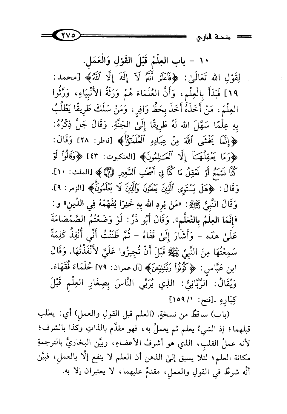 لِقَوْلِ اللَّهِ تَعَالَى: {فَاعْلَمْ أَنَّهُ لَا إِلَهَ إلا اللَّهُ} [محمد: 19] فَبَدَأَ بِالعِلْمِ "وَأَنَّ العُلَمَاءَ هُمْ وَرَثَةُ الأَنْبِيَاءِ، وَرَّثُوا العِلْمَ، مَنْ أَخَذَهُ أَخَذَ بِحَظٍّ وَافِرٍ، وَمَنْ سَلَكَ طَرِيقًا يَطْلُبُ بِهِ عِلْمًا سَهَّلَ اللَّهُ لَهُ طَرِيقًا إِلَى الجَنَّةِ" وَقَالَ جَلَّ ذِكْرُهُ: {إِنَّمَا يَخْشَى اللَّهَ مِنْ عِبَادِهِ العُلَمَاءُ} [فاطر: 28] وَقَالَ: {وَمَا يَعْقِلُهَا إلا العَالِمُونَ} [العنكبوت: 43] {وَقَالُوا لَوْ كُنَّا نَسْمَعُ أَوْ نَعْقِلُ مَا كُنَّا فِي أَصْحَابِ السَّعِيرِ} [الملك: 10] وَقَالَ: {هَلْ يَسْتَوي الَّذِينَ يَعْلَمُونَ وَالَّذِينَ لَا يَعْلَمُونَ} [الزمر: 9] وَقَالَ النَّبِيُّ صَلَّى اللهُ عَلَيْهِ وَسَلَّمَ: "مَنْ يُرِدِ اللَّهُ بِهِ خَيْرًا يُفَقِّهْهُ فِي الدِّينِ" وَإِنَّمَا العِلْمُ بِالتَّعَلُّمِ " وَقَالَ أَبُو ذَرٍّ: "لَوْ وَضَعْتُمُ الصَّمْصَامَةَ عَلَى هَذِهِ - وَأَشَارَ إِلَى قَفَاهُ - ثُمَّ ظَنَنْتُ أَنِّي أُنْفِذُ كَلِمَةً سَمِعْتُهَا مِنَ النَّبِيِّ صَلَّى اللهُ عَلَيْهِ وَسَلَّمَ قَبْلَ أَنْ تُجِيزُوا عَلَيَّ لَأَنْفَذْتُهَا" وَقَالَ ابْنُ عَبَّاسٍ: {كُونُوا رَبَّانِيِّينَ} [آل عمران: 79] " حُلَمَاءَ فُقَهَاءَ، وَيُقَالُ: الرَّبَّانِيُّ الَّذِي يُرَبِّي النَّاسَ بِصِغَارِ العِلْمِ قَبْلَ كِبَارِهِ" [فتح: 1/ 159]