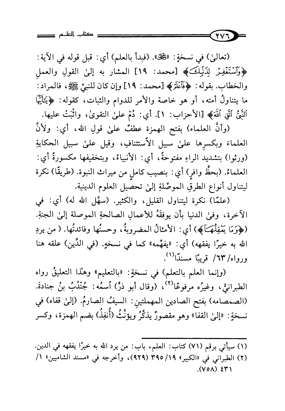 (وإنما العلم بالتعلم) في نسخةٍ: "بالتعليم" وهذا التعليقُ رواه الطبراني، وغيرُه مرفوعًا (¬2)، (وقال أبو ذرٍّ) اسمُه: جُنْدُبُ بنُ جنادةَ. (الصمصامه) بفتح الصادين المهملتينِ: السيفُ الصارمُ. (إلى قفاه) في نسخةٍ: "إلا القفا" وهو مقصورٌ يذكَّرُ ويؤنَّثُ (أُنفِذُ) بضم الهمزة، وكسر