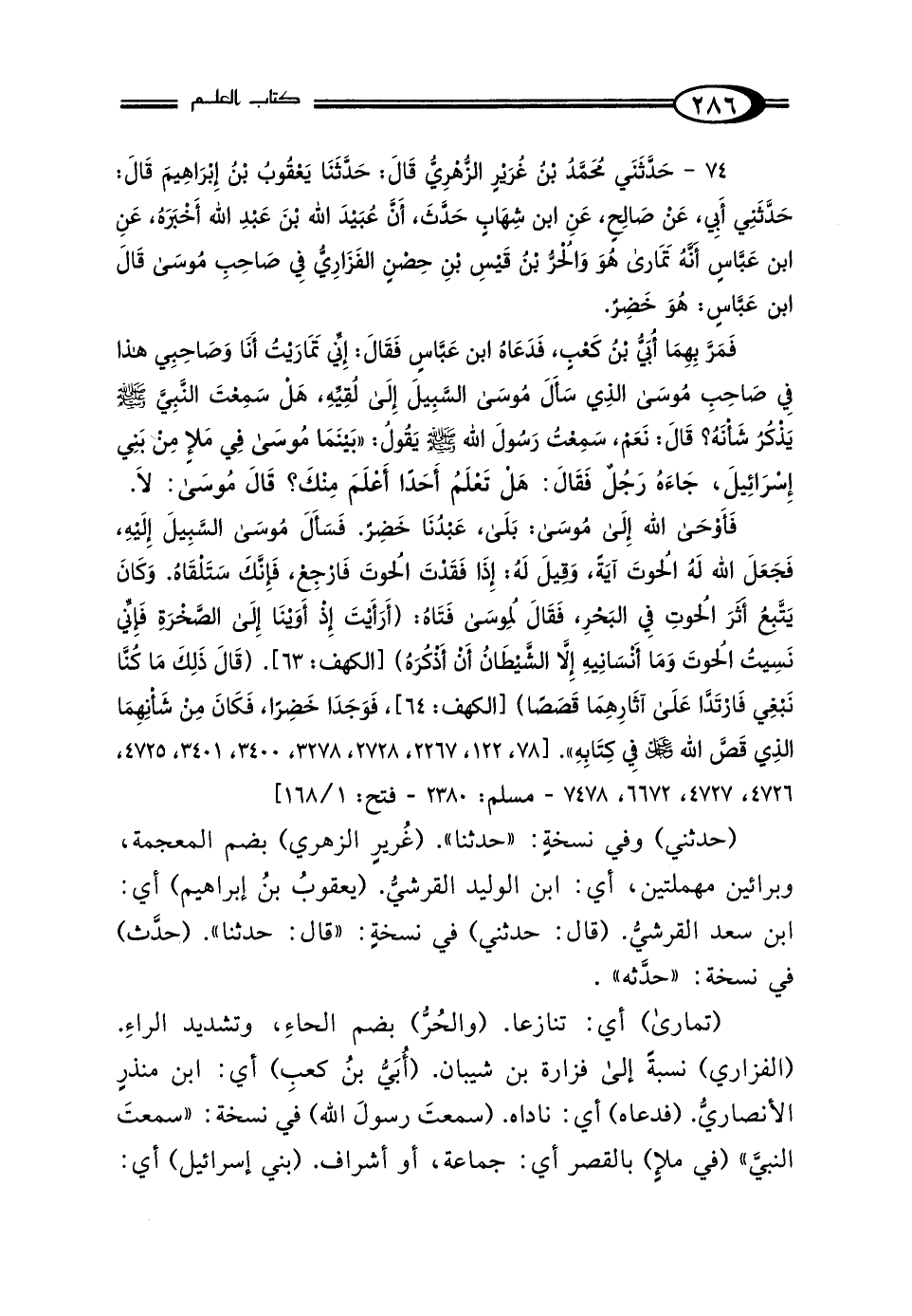 74 - حَدَّثَنِي مُحَمَّدُ بْنُ غُرَيْرٍ الزُّهْرِيُّ، قَالَ: حَدَّثَنَا يَعْقُوبُ بْنُ إِبْرَاهِيمَ، قَالَ: حَدَّثَنِي أَبِي، عَنْ صَالِحٍ، عَنِ ابْنِ شِهَابٍ، حَدَّثَهُ أَنَّ عُبَيْدَ اللَّهِ بْنَ عَبْدِ اللَّهِ أَخْبَرَهُ عَنِ ابْنِ عَبَّاسٍ أَنَّهُ تَمَارَى هُوَ وَالحُرُّ بْنُ قَيْسِ بْنِ حِصْنٍ الفَزَارِيُّ فِي صَاحِبِ مُوسَى، قَالَ ابْنُ عَبَّاسٍ: هُوَ خَضِرٌ، فَمَرَّ بِهِمَا أُبَيُّ بْنُ كَعْبٍ، فَدَعَاهُ ابْنُ عَبَّاسٍ فَقَالَ: إِنِّي تَمَارَيْتُ أَنَا وَصَاحِبِي هَذَا فِي صَاحِبِ مُوسَى، الَّذِي سَأَلَ مُوسَى السَّبِيلَ إِلَى لُقِيِّهِ، هَلْ سَمِعْتَ النَّبِيَّ صَلَّى اللهُ عَلَيْهِ وَسَلَّمَ يَذْكُرُ شَأْنَهُ؟ قَالَ: نَعَمْ، سَمِعْتُ رَسُولَ اللَّهِ صَلَّى اللهُ عَلَيْهِ وَسَلَّمَ يَقُولُ: "بَيْنَمَا مُوسَى فِي مَلَإٍ مِنْ بَنِي إِسْرَائِيلَ جَاءَهُ رَجُلٌ فَقَالَ: هَلْ تَعْلَمُ أَحَدًا أَعْلَمَ مِنْكَ؟ " قَالَ مُوسَى: لَا، فَأَوْحَى اللَّهُ عَزَّ وَجَلَّ إِلَى مُوسَى: بَلَى، عَبْدُنَا خَضِرٌ، فَسَأَلَ مُوسَى السَّبِيلَ إِلَيْهِ، فَجَعَلَ اللَّهُ لَهُ الحُوتَ آيَةً، وَقِيلَ لَهُ: إِذَا فَقَدْتَ الحُوتَ فَارْجِعْ، فَإِنَّكَ سَتَلْقَاهُ، وَكَانَ يَتَّبِعُ أَثَرَ الحُوتِ فِي البَحْرِ، فَقَالَ لِمُوسَى فَتَاهُ: (أَرَأَيْتَ إِذْ أَوَيْنَا إِلَى الصَّخْرَةِ فَإِنِّي نَسِيتُ الحُوتَ وَمَا أَنْسَانِيهِ إلا الشَّيْطَانُ أَنْ أَذْكُرَهُ)، قَالَ: (ذَلِكَ مَا كُنَّا نَبْغِي فَارْتَدَّا عَلَى آثَارِهِمَا قَصَصًا)، فَوَجَدَا خَضِرًا، فَكَانَ مِنْ شَأْنِهِمَا الَّذِي قَصَّ اللَّهُ عَزَّ وَجَلَّ فِي كِتَابِهِ" [78، 122، 2267، 2728، 3278، 3400، 3401، 4725، 4726، 4727، 6672، 7478 - مسلم: 2380 - فتح: 1/ 168]