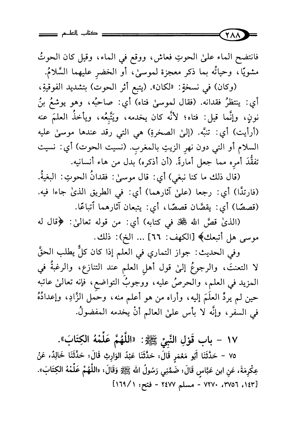 وفي الحديث: جواز التماري في العلم إذا كان كلٌّ يطلب الحقَّ لا التعنتَ، والرجوعُ إلى قول أهلِ العلمِ عند التنازع، والرغبةُ في المزيد في العلم، والحرصُ عليه، ووجوبُ التواضعِ، فإنه تعالى عاتبه حين لم يردِّ العلَمَ إليه، وأراه من هو أعلم منه، وحمل الزَّادِ، وإعدادُهُ في السفر، وإنَّه لا بأس على العالم أنْ يخدمه المفضولُ.