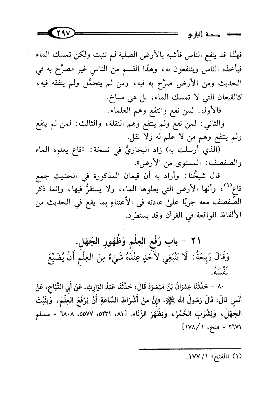 فهذا قد ينفع الناس فأشبه بالأرض الصلبة لم تنبت ولكن تمسك الماء فيأخذه الناس وينتفعون به، وهذا القسم من الناسِ غير مصرَّح به في الحديث ومن الأرض صرَّح به فيه، ومن لم يتحمَّل ولم يتفقه فيه، كالقيعان التي لا تمسك الماء، بل هي سباخ.