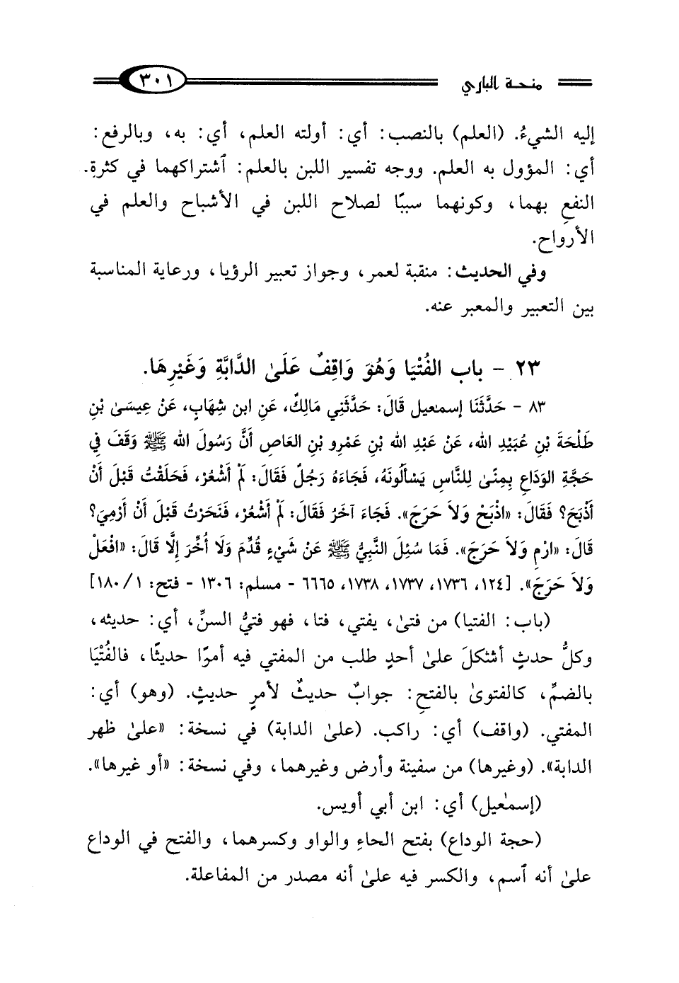 23 - بَابُ الفُتْيَا وَهُوَ وَاقِفٌ عَلَى الدَّابَّةِ وَغَيْرِهَا.