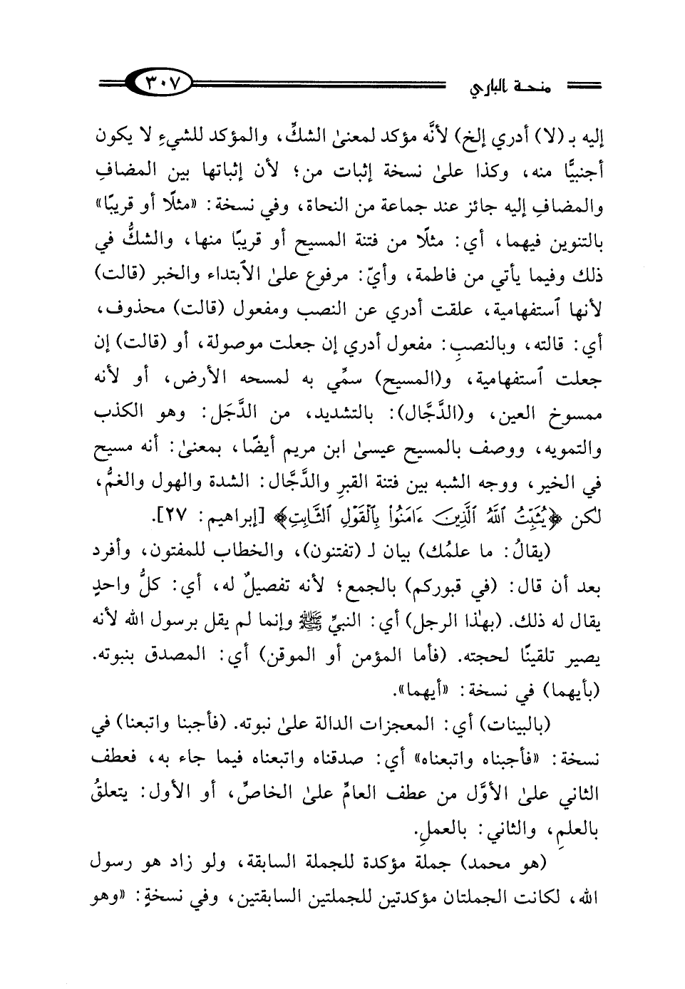 إليه بـ (لا) أدري إلخ) لأنَّه مؤكد لمعنى الشد، والمؤكد للشيءِ لا يكون أجنبيًّا منه، وكذا على نسخة إثبات من؛ لأن إثباتها بين المضافِ والمضافِ إليه جائز عند جماعة من النحاة، وفي نسخة: "مثلًا أو قريبًا" بالتنوين فيهما، أي: مثلًا من فتنة المسيح أو قريبًا منها، والشكُّ في ذلك وفيما يأتي من فاطمة، وأيّ: مرفوع على الابتداء والخبر (قالت) لأنها استفهامية، علقت أدري عن النصب ومفعول (قالت) محذوف، أي: قالته، وبالنصبِ: مفعول أدري إن جعلت موصولة، أو (قالت) إن جعلت استفهامية، و (المسيح) سمِّي به لمسحه الأرض، أو لأنه ممسوخ العين، و (الدَّجَّال): بالتشديد، من الدَّجَل: وهو الكذب والتمويه، ووصف بالمسيح عيسى بن مريم أيضًا، بمعنى: أنه مسيح في الخير، ووجه الشبه بين فتنة القبرِ والدَّجَّال: الشدة والهول والغمُّ، لكن {يُثَبِّتُ اللَّهُ الَّذِينَ آمَنُوا بِالْقَوْلِ الثَّابِتِ} [إبراهيم: 27].