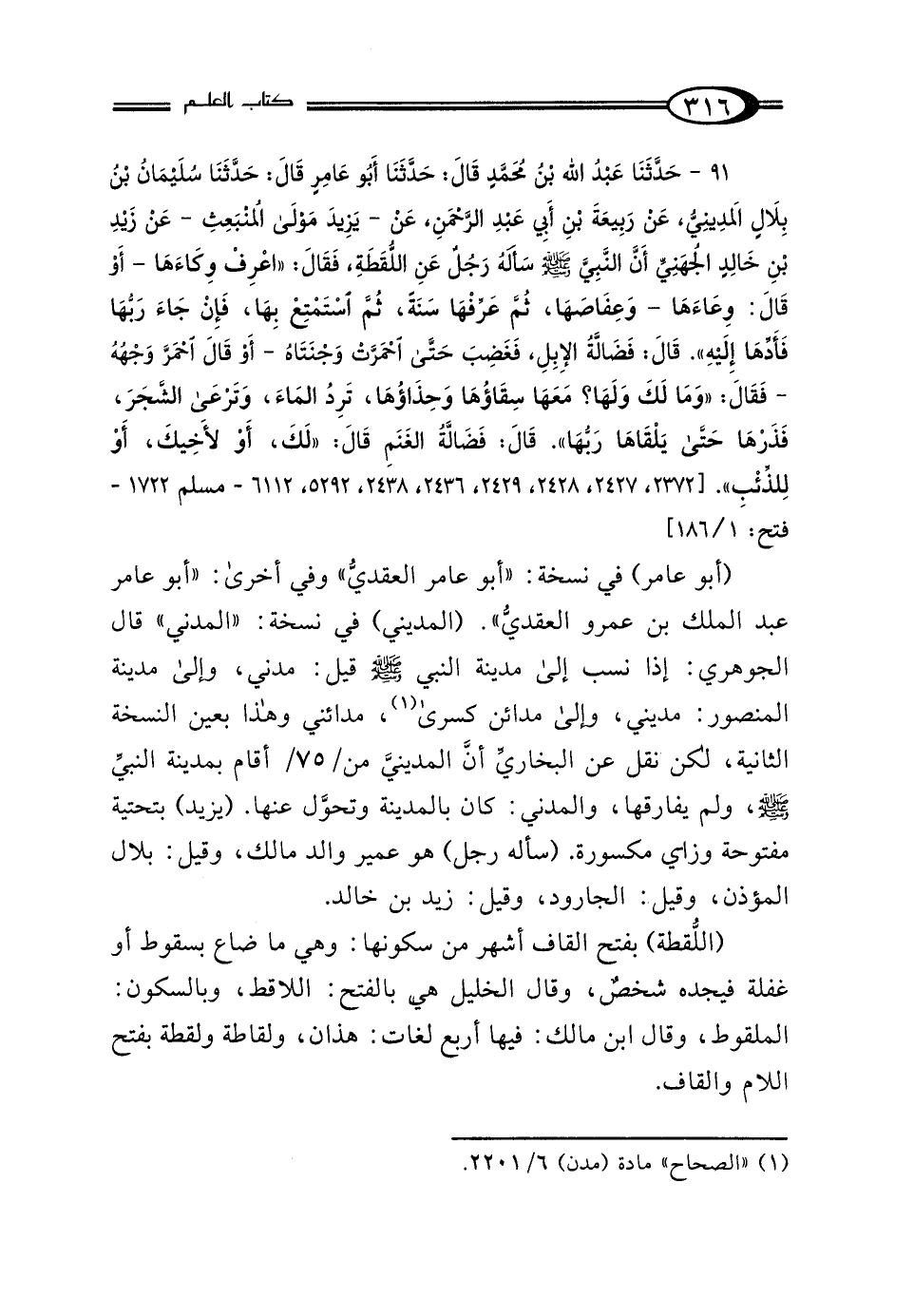 91 - حَدَّثَنَا عَبْدُ اللَّهِ بْنُ مُحَمَّدٍ، قَالَ: حَدَّثَنَا عَبْدُ المَلِكِ بْنُ عَمْرٍو العَقَدِيُّ، قَالَ: حَدَّثَنَا سُلَيْمَانُ بْنُ بِلالٍ المَدِينِيُّ، عَنْ رَبِيعَةَ بْنِ أَبِي عَبْدِ الرَّحْمَنِ، عَنْ يَزِيدَ مَوْلَى المُنْبَعِثِ عَنْ زَيْدِ بْنِ خَالِدٍ الجُهَنِيِّ أَنَّ النَّبِيَّ صَلَّى اللهُ عَلَيْهِ وَسَلَّمَ سَأَلَهُ رَجُلٌ عَنِ اللُّقَطَةِ، فَقَالَ: "اعْرِفْ وكَاءَهَا، أَوْ قَالَ وعَاءَهَا، وَعِفَاصَهَا، ثُمَّ عَرِّفْهَا سَنَةً، ثُمَّ اسْتَمْتِعْ بِهَا، فَإِنْ جَاءَ رَبُّهَا فَأَدِّهَا إِلَيْهِ" قَالَ: فَضَالَّةُ الإِبِلِ؟ فَغَضِبَ حَتَّى احْمَرَّتْ وَجْنَتَاهُ، أَوْ قَالَ احْمَرَّ وَجْهُهُ، فَقَالَ: "وَمَا لَكَ وَلَهَا، مَعَهَا سِقَاؤُهَا وَحِذَاؤُهَا، تَرِدُ المَاءَ وَتَرْعَى الشَّجَرَ، فَذَرْهَا حَتَّى يَلْقَاهَا رَبُّهَا" قَالَ: فَضَالَّةُ الغَنَمِ؟ قَالَ: "لَكَ، أَوْ لِأَخِيكَ، أَوْ لِلذِّئْبِ".