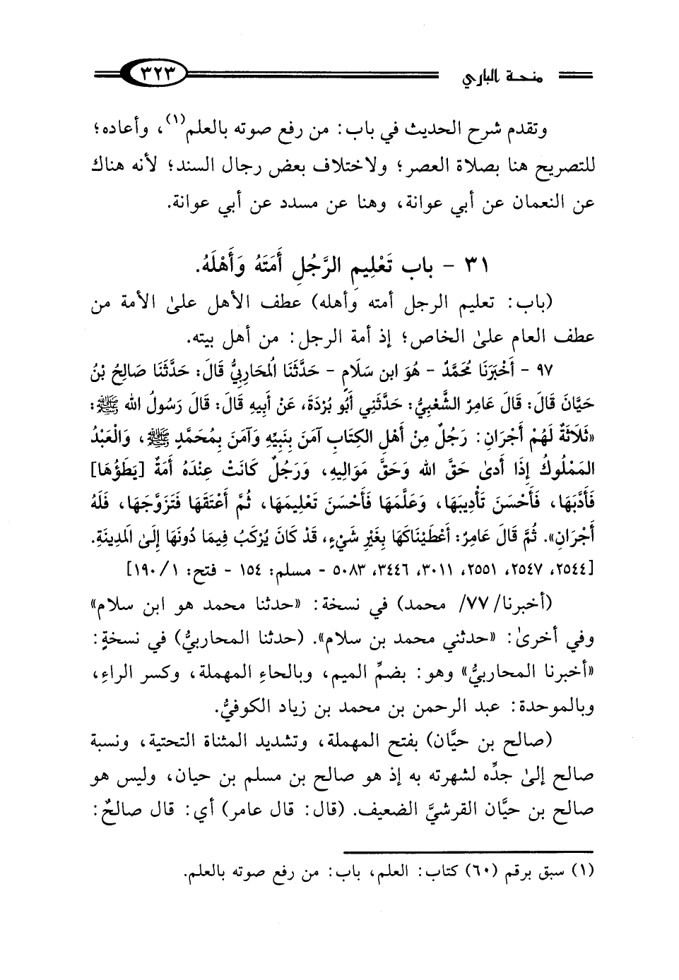 97 - أَخْبَرَنَا مُحَمَّدٌ هُوَ ابْنُ سَلامٍ، حَدَّثَنَا المُحَارِبِيُّ، قَالَ: حَدَّثَنَا صَالِحُ بْنُ حَيَّانَ، قَالَ: قَالَ عَامِرٌ الشَّعْبِيُّ: حَدَّثَنِي أَبُو بُرْدَةَ، عَنْ أَبِيهِ، قَالَ: قَالَ رَسُولُ اللَّهِ صَلَّى اللهُ عَلَيْهِ وَسَلَّمَ: "ثَلاثَةٌ لَهُمْ أَجْرَانِ: رَجُلٌ مِنْ أَهْلِ الكِتَابِ، آمَنَ بِنَبِيِّهِ وَآمَنَ بِمُحَمَّدٍ صَلَّى اللهُ عَلَيْهِ وَسَلَّمَ، وَالعَبْدُ المَمْلُوكُ إِذَا أَدَّى حَقَّ اللَّهِ وَحَقَّ مَوَالِيهِ، وَرَجُلٌ كَانَتْ عِنْدَهُ أَمَةٌ فَأَدَّبَهَا فَأَحْسَنَ تَأْدِيبَهَا، وَعَلَّمَهَا فَأَحْسَنَ تَعْلِيمَهَا، ثُمَّ أَعْتَقَهَا فَتَزَوَّجَهَا فَلَهُ أَجْرَانِ"، ثُمَّ قَالَ عَامِرٌ: أَعْطَيْنَاكَهَا بِغَيْرِ شَيْءٍ، قَدْ كَانَ يُرْكَبُ فِيمَا دُونَهَا إِلَى المَدِينَةِ.