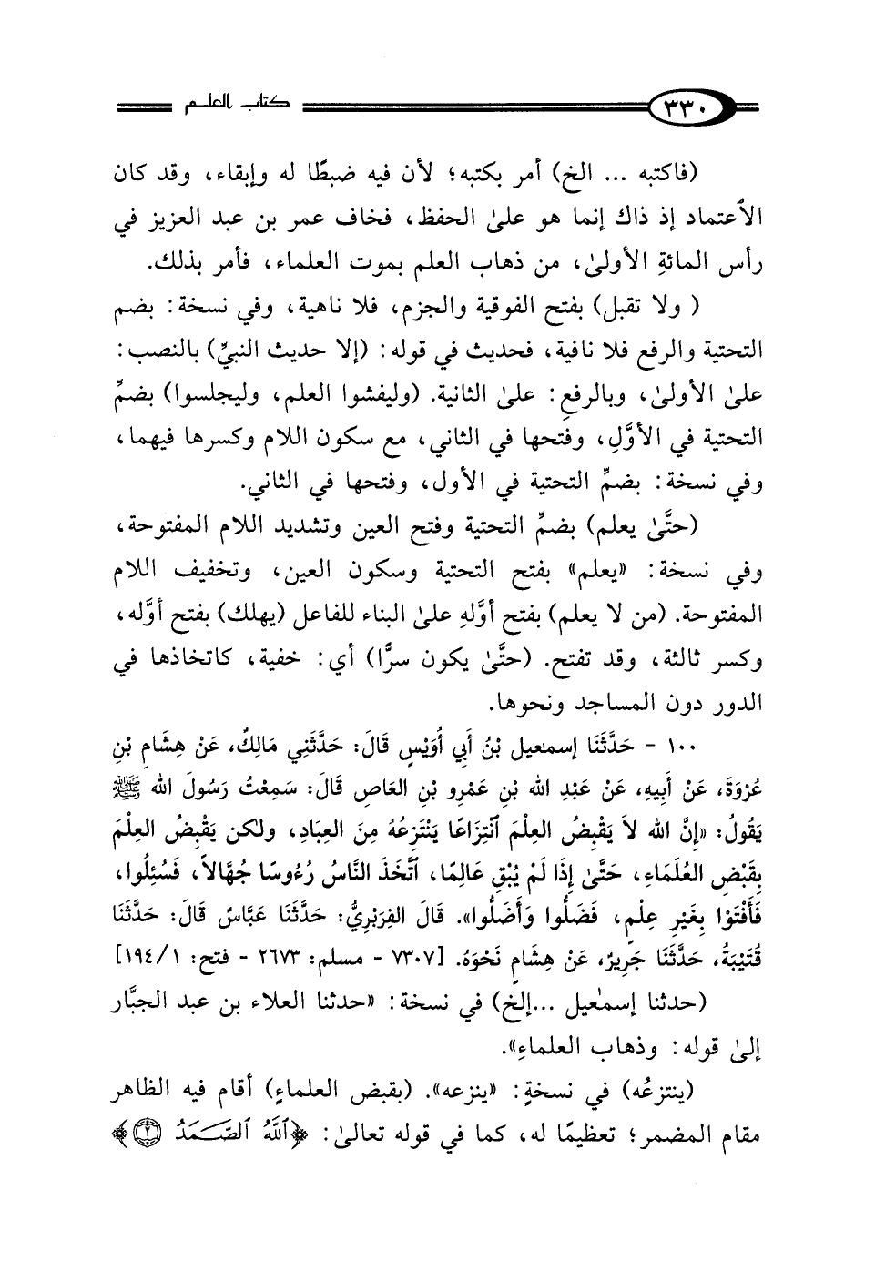 (حتَّى يعلم) بضمِّ التحتية وفتح العين وتشديد اللام المفتوحة، وفي نسخة: "يعلم" بفتح التحتية وسكون العين، وتخفيف اللام المفتوحة. (من لا يعلم) بفتح أوَّلهِ على البناء للفاعل (يهلك) بفتح أوَّله، وكسر ثالثة، وقد تفتح. (حتَّى يكون سرًّا) أي: خفية، كاتخاذها في الدور دون المساجد ونحوها.