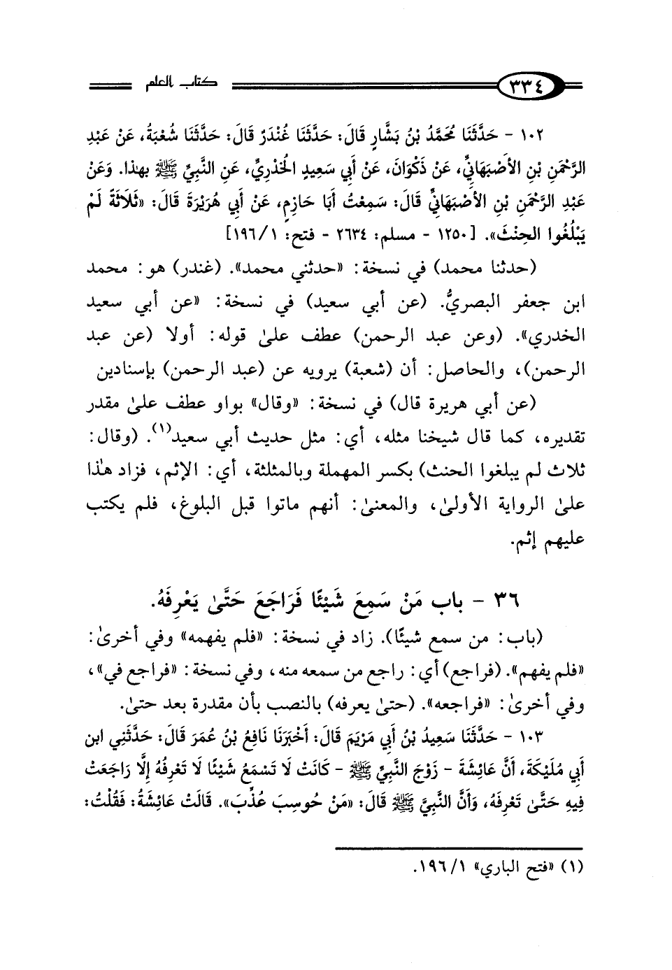 (باب: من سمع شيئًا). زاد في نسخة: "فلم يفهمه" وفي أخرى: "فلم يفهم". (فراجع) أي: راجع من سمعه منه، وفي نسخة: "فراجع في "، وفي أخرى: "فراجعه". (حتى يعرفه) بالنصب بأن مقدرة بعد حتى.