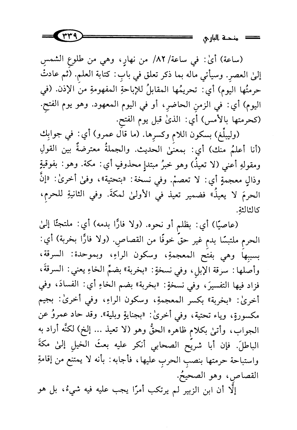 (عاصيًا) أي: بظلمٍ أو نحوه. (ولا فارًّا بدمه) أي: ملتجئًا إلى الحرمِ ملتبسًا بدمِ غير حق خوفًا من القصاصِ. (ولا فارًّا بخربة) أي: بسببِها وهي بفتح المعجمةِ، وسكون الراءِ، وبموحدة: السرقة، وأصلها: سرقة الإبلِ، وفي نسخةٍ: "بخربة" بضمِّ الخاءِ يعني: السرقةَ، فزاد فيها التفسيرَ، وفي نسخةٍ: "بخربة" بضم الخاءِ أي: الفسادَ، وفي أخرى: "بخربة" بكسر المعجمةِ، وسكون الراءِ، وفي أخرى: بجيم مكسورةٍ، وياء تحتية، وفي أخرى: "بجنايةٍ وبلية". وقد حاد عمروُ عن الجواب، وأتى بكلامٍ ظاهره الحقُّ وهو (لا تعيذ ... إلخ) لكنَّه أراد به الباطلَ. فإن أبا شريح الصحابي أنكر عليه بعثَ الخيلِ إلى مكةَ واستباحة حرمتها بنصبِ الحربِ عليها، فأجابه: بأنه لا يمتنع من إقامةِ القصاصِ، وهو الصحيحُ.