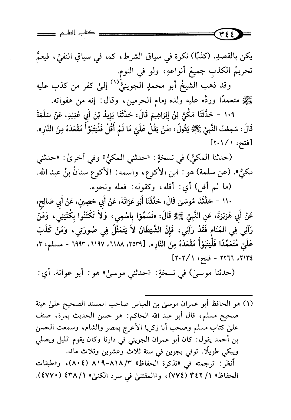 (¬1) هو الحافظ أبو عمران موسى بن العباس صاحب المسند الصحيح على هيئة صحيح مسلم، قال أبو عبد الله الحاكم: هو حسن الحديث بمرة، صنف على كتاب مسلم وصحب أبا زكريا الأعرج بمصر والشام، وسمعت الحسن بن أحمد يقول: كان أبو عمران الجويني في دارنا وكان يقوم الليل ويصلي ويبكي طويلًا. توفي بجوين في سنة ثلاث وعشرين وثلاث مائة.