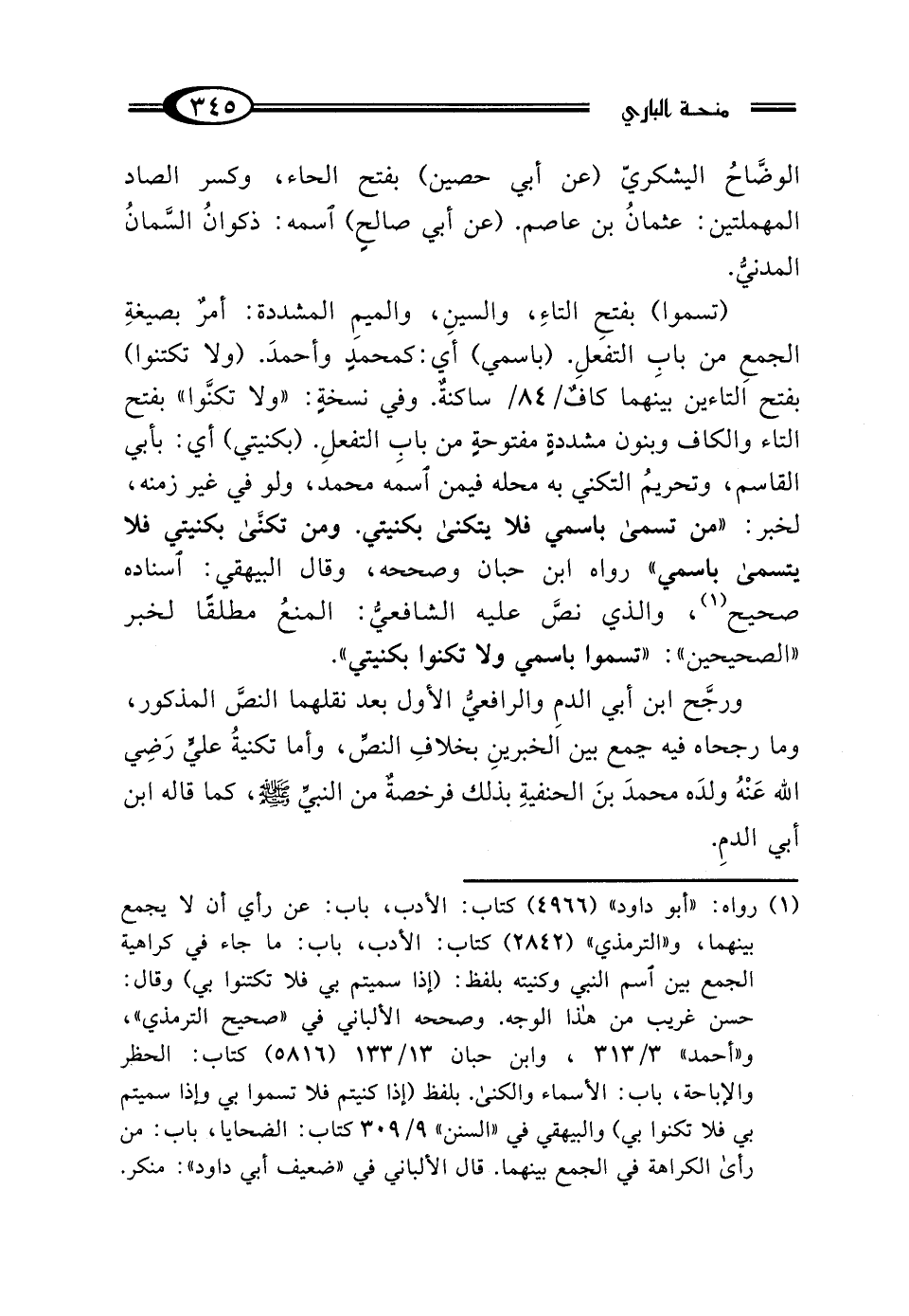 ورجَّح ابن أبي الدمِ والرافعيُّ الأول بعد نقلهما النصَّ المذكور، وما رجحاه فيه جمع بين الخبرينِ بخلافِ النصّ، وأما تكنيةُ عليٍّ رَضِي الله عَنْهُ ولدَه محمدَ بنَ الحنفيةِ بذلك فرخصةٌ من النبيِّ - صلى الله عليه وسلم -، كما قاله ابن أبي الدمِ.