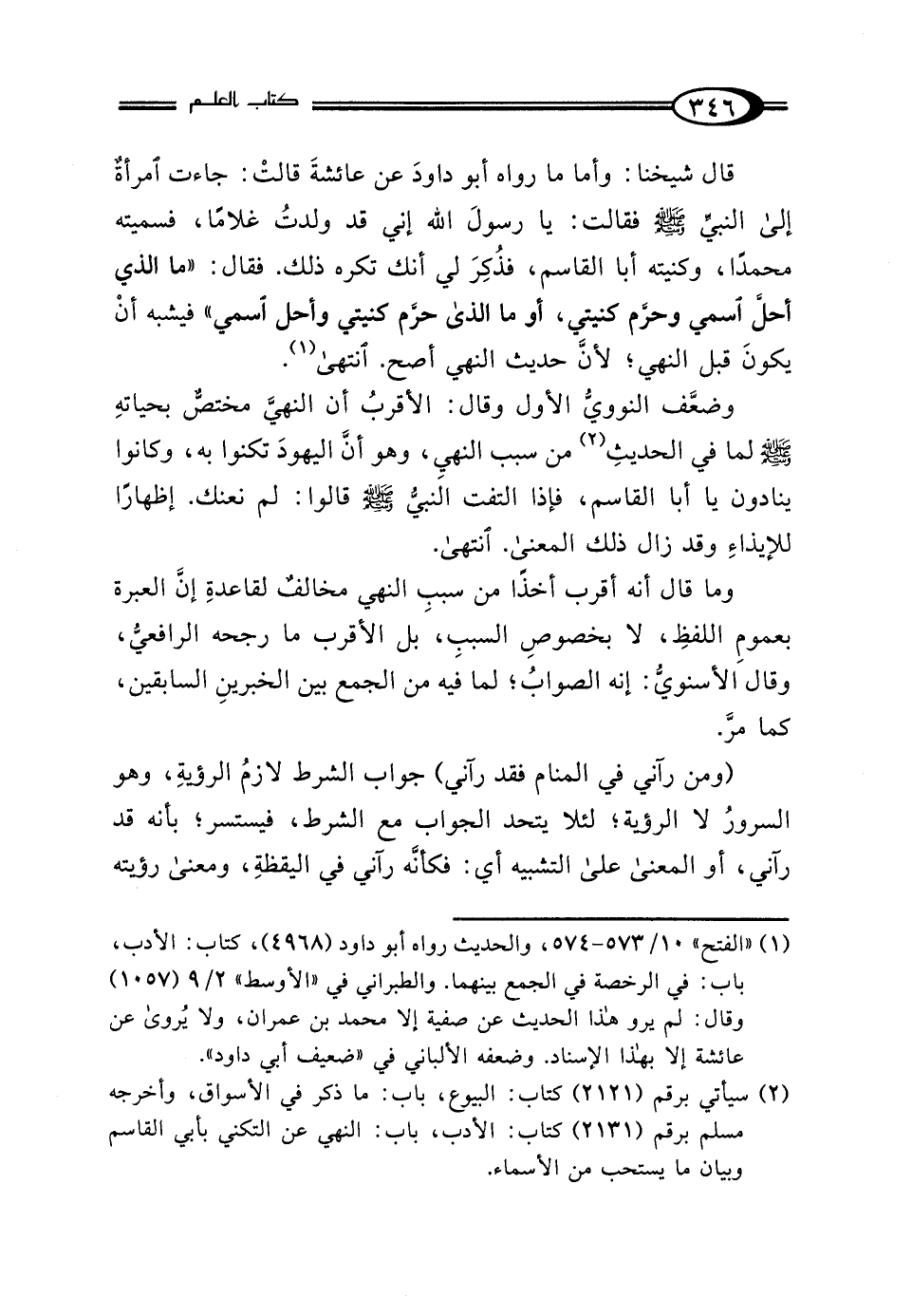 قال شيخنا: وأما ما رواه أبو داودَ عن عائشةَ قالتْ: جاءت امرأة إلى النبيِّ - صلى الله عليه وسلم - فقالت: يا رسولَ الله إني قد ولدتُ غلامًا، فسميته محمدًا، وكنيته أبا القاسم، فذُكِرَ لي أنك تكره ذلك. فقال: "ما الذي أحل اسمي وحرَّم كنيتي، أو ما الذي حرّم كنيتي وأحل اسمي" فيشبه أنْ يكونَ قبل النهي؛ لأنَّ حديث النهي أصح. انتهى (¬1).