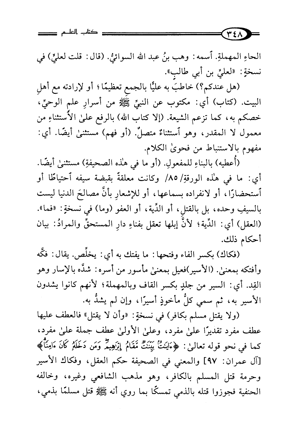 (ولا يقتل مسلم بكافر) في نسخةٍ: "وأن لا يقتل" فالعطف عليها عطف مفرد تقديرًا على مفرد، وعلى الأولى عطف جملة على مفرد، كما في نحو قوله تعالى: {آيَاتٌ بَيِّنَاتٌ مَقَامُ إِبْرَاهِيمَ وَمَنْ دَخَلَهُ كَانَ آمِنًا} [آل عمران: 97] والمعني في الصحيفة حكم العقل، وفكاك الأسير وحرمة قتل المسلم بالكافر، وهو مذهب الشافعي وغيره، وخالفه الحنفية فجوزوا قتله بالذمي تمسكًا بما روي أنه - صلى الله عليه وسلم - قتل مسلمًا بذمي،