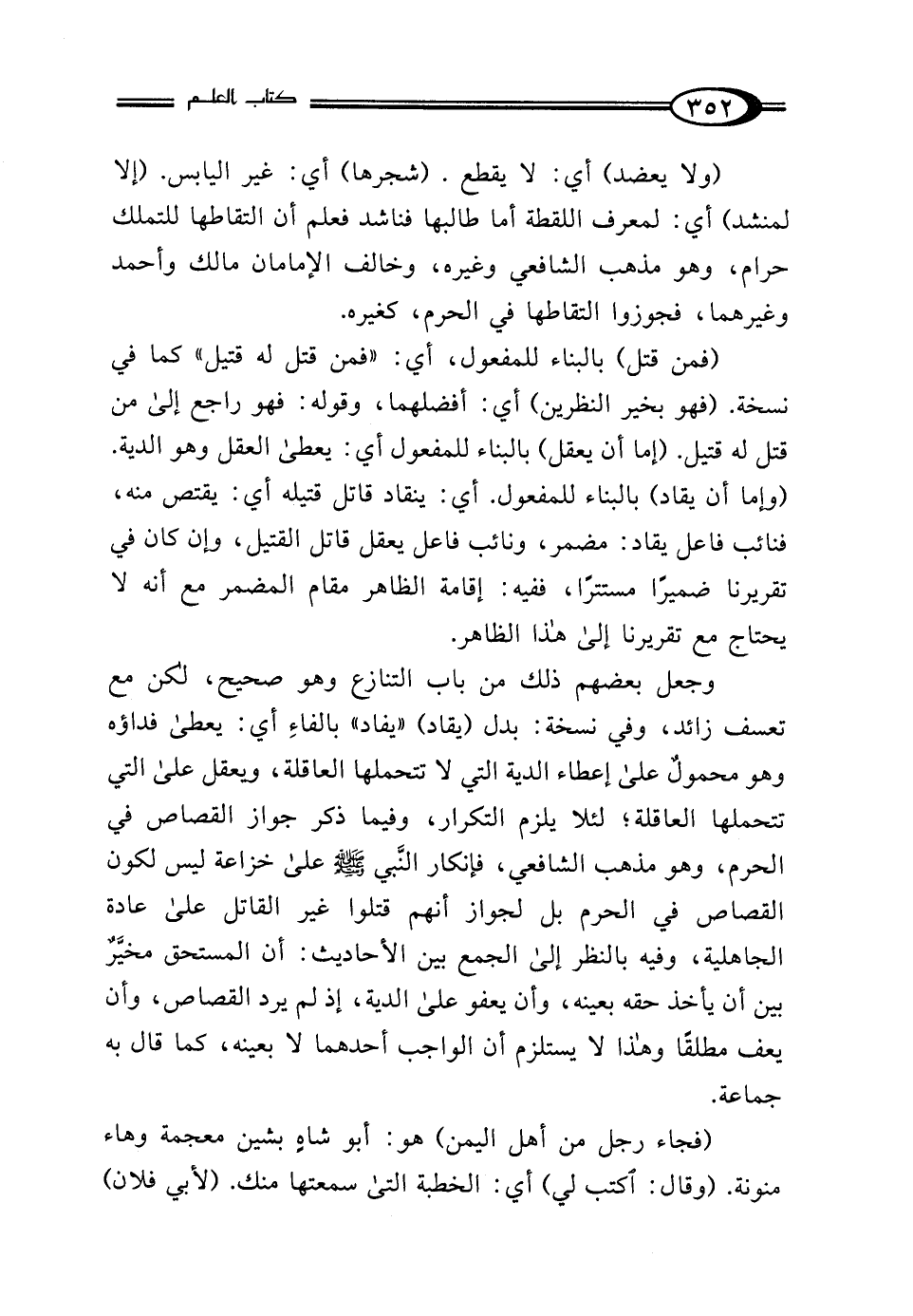 وجعل بعضهم ذلك من باب التنازع وهو صحيح، لكن مع تعسف زائد، وفي نسخة: بدل (يقاد) "يفاد" بالفاءِ أي: يعطى فداؤه وهو محمولٌ على إعطاء الدية التي لا تتحملها العاقلة، ويعقل على التي تتحملها العاقلة؛ لئلا يلزم التكرار، وفيما ذكر جواز القصاص في الحرم، وهو مذهب الشافعي، فإنكار النَّبي - صلى الله عليه وسلم - على خزاعة ليس لكون القصاص في الحرم بل لجواز أنهم قتلوا غير القاتل على عادة الجاهلية، وفيه بالنظر إلى الجمع بين الأحاديث: أن المستحق مخير بين أن يأخذ حقه بعينه، وأن يعفو على الدية، إذ لم يرد القصاص، وأن يعف مطلقًا وهذا لا يستلزم أن الواجب أحدهما لا بعينه، كما قال به جماعة.