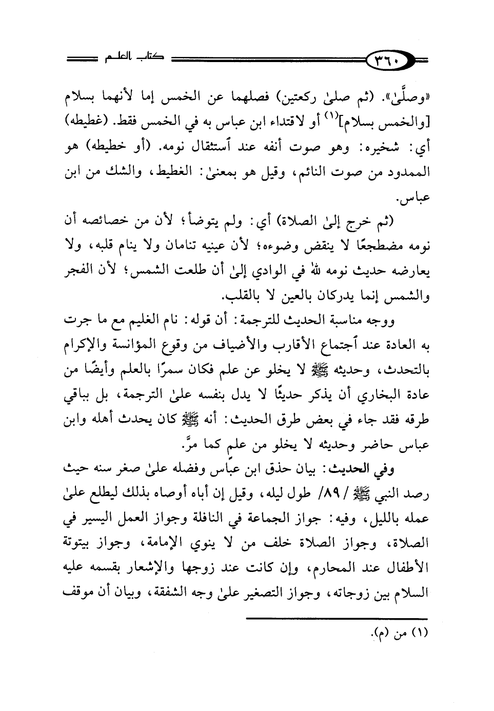 ووجه مناسبة الحديث للترجمة: أن قوله: نام الغليم مع ما جرت به العادة عند اجتماع الأقارب والأضياف من وقوع المؤانسة والإكرام بالتحدث، وحديثه - صلى الله عليه وسلم - لا يخلو عن علم فكان سمرًا بالعلم وأيضًا من عادة البخاري أن يذكر حديثًا لا يدل بنفسه على الترجمة، بل بباقي طرقه فقد جاء في بعض طرق الحديث: أنه - صلى الله عليه وسلم - كان يحدث أهله وابن عباس حاضر وحديثه لا يخلو من علمٍ كما مرَّ.