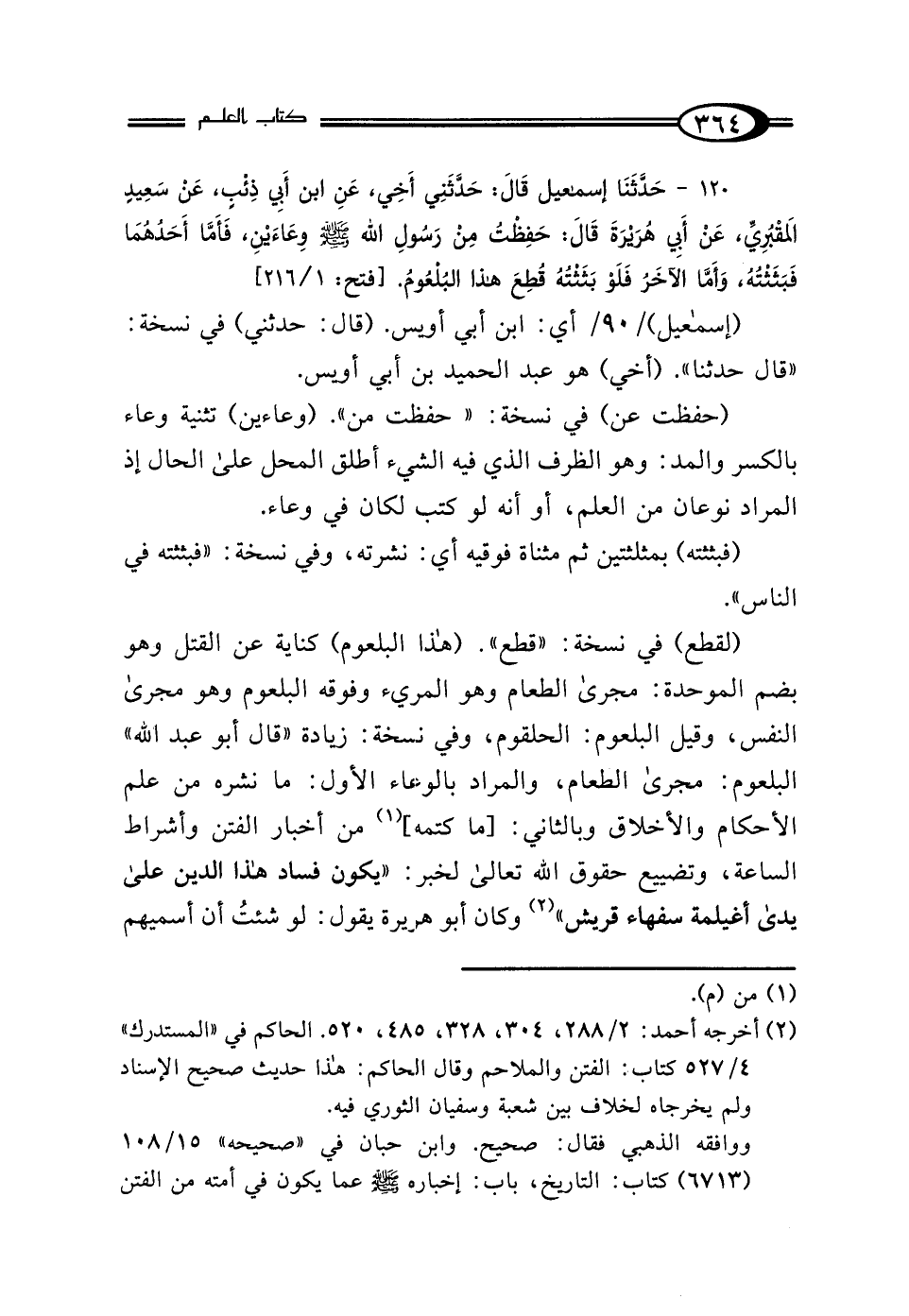 120 - حَدَّثَنَا إِسْمَاعِيلُ، قَالَ: حَدَّثَنِي أَخِي، عَنِ ابْنِ أَبِي ذِئْبٍ، عَنْ سَعِيدٍ المَقْبُرِيِّ، عَنْ أَبِي هُرَيْرَةَ قَالَ: "حَفِظْتُ مِنْ رَسُولِ اللَّهِ صَلَّى اللهُ عَلَيْهِ وَسَلَّمَ وعَاءَيْنِ: فَأَمَّا أَحَدُهُمَا فَبَثَثْتُهُ، وَأَمَّا الآخَرُ فَلَوْ بَثَثْتُهُ قُطِعَ هَذَا البُلْعُومُ".