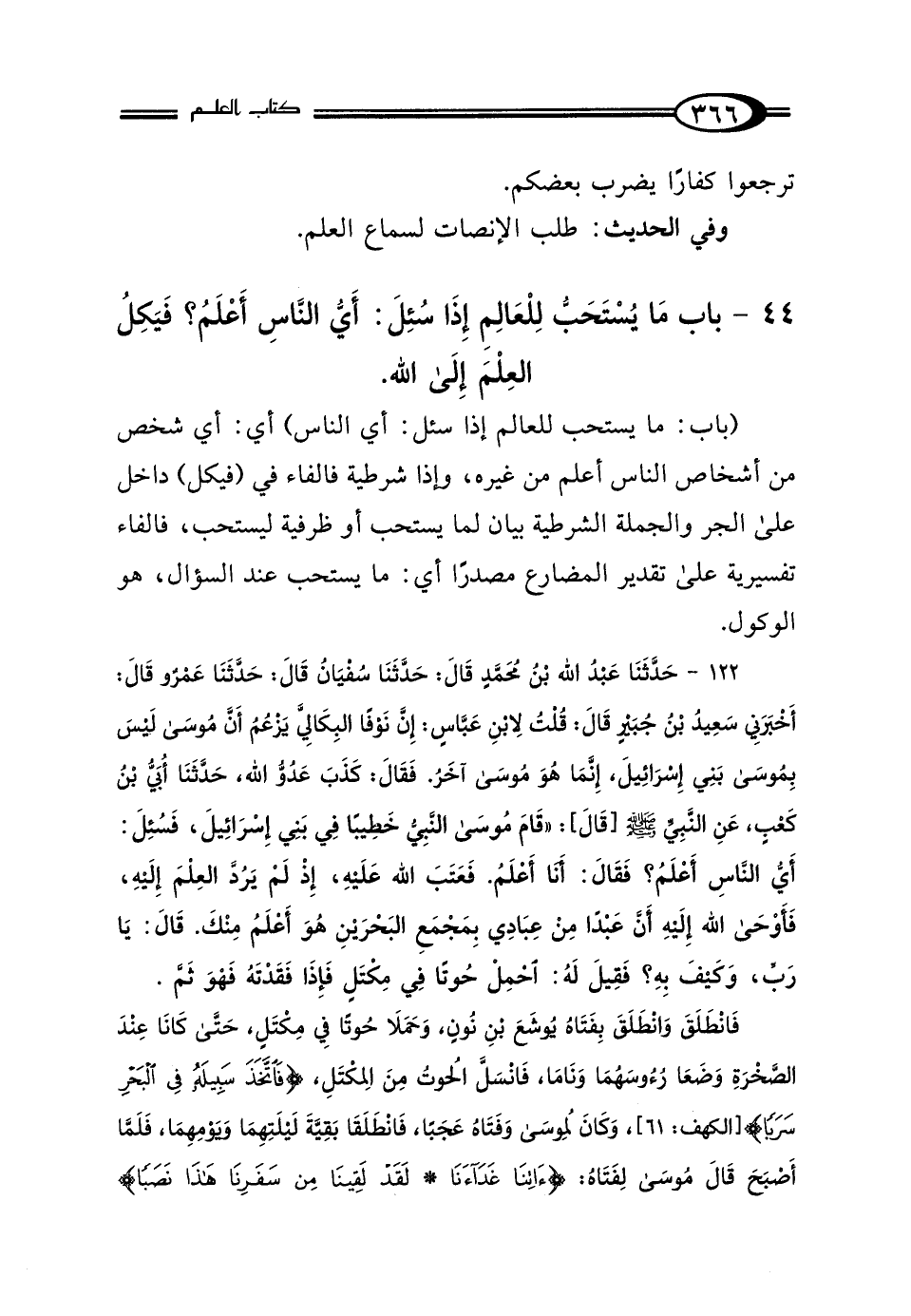 44 - بَابُ مَا يُسْتَحَبُّ لِلْعَالِمِ إِذَا سُئِلَ: أَيُّ النَّاسِ أَعْلَمُ؟ فَيَكِلُ العِلْمَ إِلَى اللَّهِ.