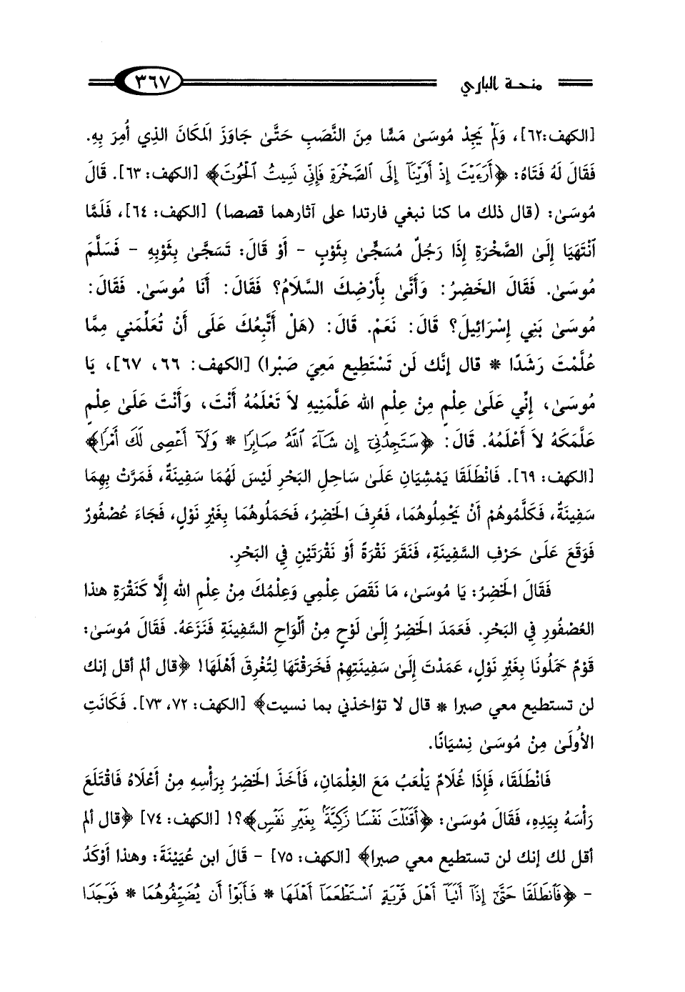 وَلَمْ يَجِدْ مُوسَى مَسًّا مِنَ النَّصَبِ حَتَّى جَاوَزَ المَكَانَ الَّذِي أُمِرَ بِهِ، فَقَالَ لَهُ فَتَاهُ: (أَرَأَيْتَ إِذْ أَوَيْنَا إِلَى الصَّخْرَةِ فَإِنِّي نَسِيتُ الحُوتَ وَمَا أَنْسَانِيهِ إِلَّا الشَّيْطَانُ) قَالَ مُوسَى: (ذَلِكَ مَا كُنَّا نَبْغِي فَارْتَدَّا عَلَى آثَارِهِمَا قَصَصًا) فَلَمَّا انْتَهَيَا إِلَى الصَّخْرَةِ، إِذَا رَجُلٌ مُسَجًّى بِثَوْبٍ، أَوْ قَالَ تَسَجَّى بِثَوْبِهِ، فَسَلَّمَ مُوسَى، فَقَالَ الخَضِرُ: وَأَنَّى بِأَرْضِكَ السَّلاَمُ؟ فَقَالَ: أَنَا مُوسَى، فَقَالَ: مُوسَى بَنِي إِسْرَائِيلَ؟ قَالَ: نَعَمْ، قَالَ: هَلْ أَتَّبِعُكَ عَلَى أَنْ تُعَلِّمَنِي مِمَّا عُلِّمْتَ رَشَدًا قَالَ: إِنَّكَ لَنْ تَسْتَطِيعَ مَعِيَ صَبْرًا، يَا مُوسَى إِنِّي عَلَى عِلْمٍ مِنْ عِلْمِ اللَّهِ عَلَّمَنِيهِ لاَ تَعْلَمُهُ أَنْتَ، وَأَنْتَ عَلَى عِلْمٍ عَلَّمَكَهُ لاَ أَعْلَمُهُ، قَالَ: سَتَجِدُنِي إِنْ شَاءَ اللَّهُ صَابِرًا، وَلاَ أَعْصِي لَكَ أَمْرًا، فَانْطَلَقَا يَمْشِيَانِ عَلَى سَاحِلِ البَحْرِ، لَيْسَ لَهُمَا سَفِينَةٌ، فَمَرَّتْ بِهِمَا سَفِينَةٌ، فَكَلَّمُوهُمْ أَنْ يَحْمِلُوهُمَا، فَعُرِفَ الخَضِرُ فَحَمَلُوهُمَا بِغَيْرِ نَوْلٍ، فَجَاءَ عُصْفُورٌ، فَوَقَعَ عَلَى حَرْفِ السَّفِينَةِ، فَنَقَرَ نَقْرَةً أَوْ نَقْرَتَيْنِ فِي البَحْرِ، فَقَالَ الخَضِرُ: يَا مُوسَى مَا نَقَصَ عِلْمِي وَعِلْمُكَ مِنْ عِلْمِ اللَّهِ إِلَّا كَنَقْرَةِ هَذَا العُصْفُورِ فِي البَحْرِ، فَعَمَدَ الخَضِرُ إِلَى لَوْحٍ مِنْ أَلْوَاحِ السَّفِينَةِ، فَنَزَعَهُ، فَقَالَ مُوسَى: قَوْمٌ حَمَلُونَا بِغَيْرِ نَوْلٍ عَمَدْتَ إِلَى سَفِينَتِهِمْ فَخَرَقْتَهَا لِتُغْرِقَ أَهْلَهَا؟ قَالَ: أَلَمْ أَقُلْ إِنَّكَ لَنْ تَسْتَطِيعَ مَعِيَ صَبْرًا؟ قَالَ: لاَ تُؤَاخِذْنِي بِمَا نَسِيتُ وَلاَ تُرْهِقْنِي مِنْ أَمْرِي عُسْرًا - فَكَانَتِ الأُولَى مِنْ مُوسَى نِسْيَانًا -، فَانْطَلَقَا، فَإِذَا غُلاَمٌ يَلْعَبُ مَعَ الغِلْمَانِ، فَأَخَذَ الخَضِرُ بِرَأْسِهِ مِنْ أَعْلاَهُ فَاقْتَلَعَ رَأْسَهُ بِيَدِهِ، فَقَالَ مُوسَى: أَقَتَلْتَ نَفْسًا زَكِيَّةً بِغَيْرِ نَفْسٍ؟ قَالَ: أَلَمْ أَقُلْ لَكَ إِنَّكَ لَنْ تَسْتَطِيعَ مَعِيَ صَبْرًا؟ - قَالَ ابْنُ عُيَيْنَةَ: وَهَذَا أَوْكَدُ - فَانْطَلَقَا، حَتَّى إِذَا أَتَيَا أَهْلَ قَرْيَةٍ اسْتَطْعَمَا أَهْلَهَا، فَأَبَوْا أَنْ يُضَيِّفُوهُمَا، فَوَجَدَا
