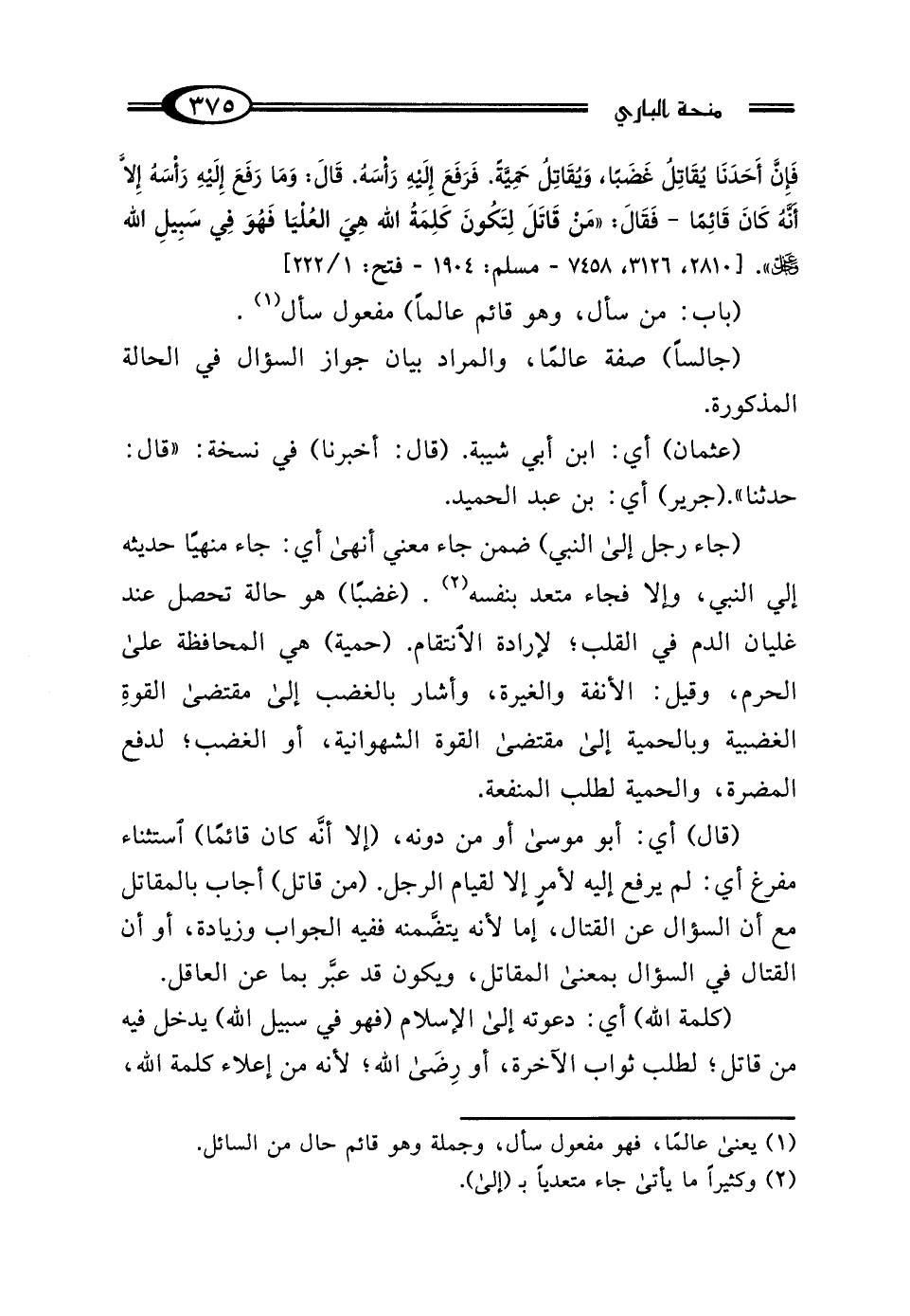 فَإِنَّ أَحَدَنَا يُقَاتِلُ غَضَبًا، وَيُقَاتِلُ حَمِيَّةً، فَرَفَعَ إِلَيْهِ رَأْسَهُ، قَالَ: وَمَا رَفَعَ إِلَيْهِ رَأْسَهُ إلا أَنَّهُ كَانَ قَائِمًا، فَقَالَ: "مَنْ قَاتَلَ لِتَكُونَ كَلِمَةُ اللَّهِ هِيَ العُلْيَا، فَهُوَ فِي سَبِيلِ اللَّهِ عَزَّ وَجَلَّ".