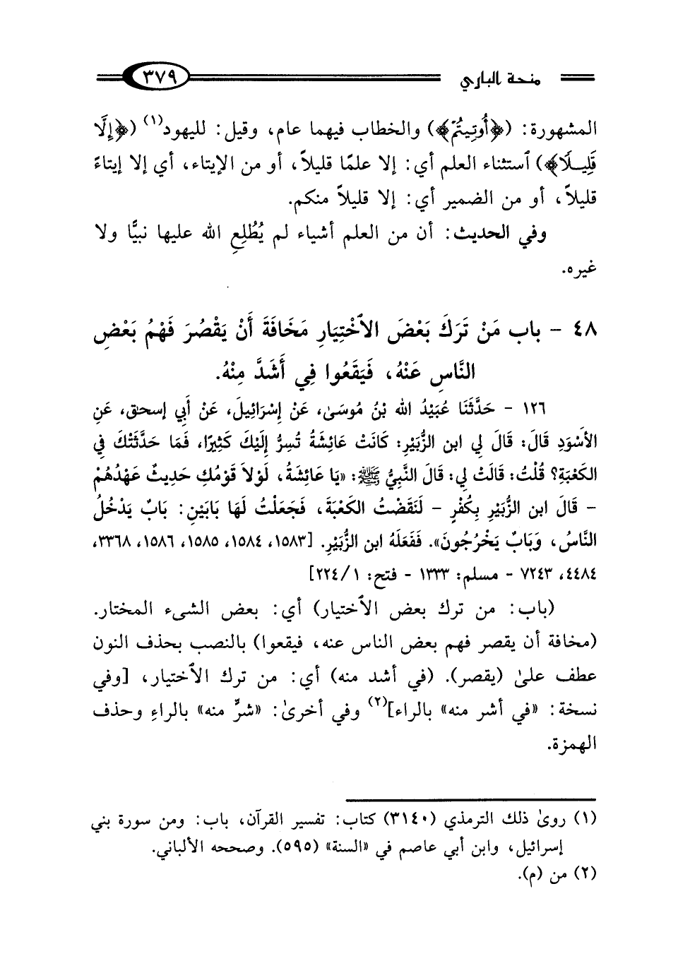 (باب: من ترك بعض الاختيار) أي: بعض الشيء المختار. (مخافة أن يقصر فهم بعض الناس عنه، فيقعوا) بالنصب بحذف النون عطف على (يقصر). (في أشد منه) أي: من ترك الاختيار، [وفي نسخة: "في أشر منه" بالراء] (¬2) وفي أخرى: "شرٍّ منه" بالراءِ وحذف الهمزة.