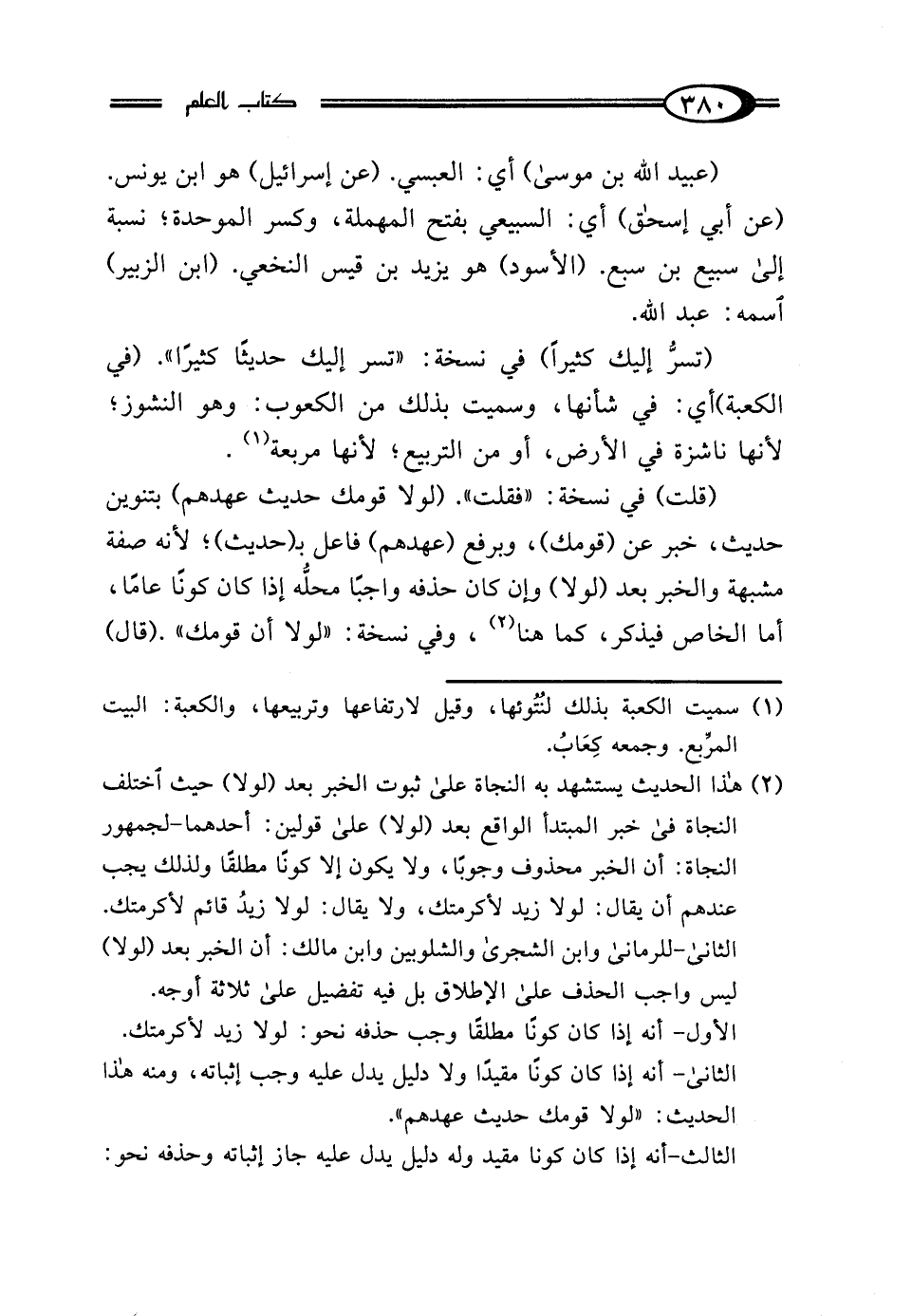 (¬2) هذا الحديث يستشهد به النجاة على ثبوت الخبر بعد (لولا) حيث اختلف النجاة في خبر المبتدأ الواقع بعد (لولا) على قولين: أحدهما -لجمهور النجاة: أن الخبر محذوف وجوبًا، ولا يكون إلا كونًا مطلقًا ولذلك يجب عندهم أن يقال: لولا زيد لأكرمتك، ولا يقال: لولا زيدُ قائم لأكرمتك. الثاني- للرماني وابن الشجري والشلوبين وابن مالك: أن الخبر بعد (لولا) ليس واجب الحذف على الإطلاق بل فيه تفضيل على ثلاثة أوجه.