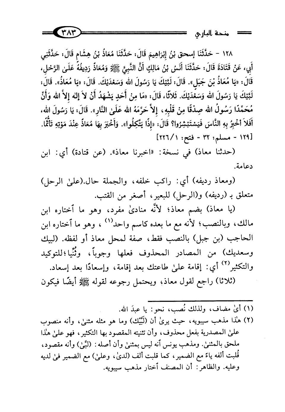 (يا معاذ) بضم معاذة لأنه منادى مفرد، وهو ما اختاره ابن مالك، وبالنصب؛ لأنه مع ما بعده كاسم واحد (¬1)، وهو ما اختاره ابن الحاجب (بن جبل) بالنصب فقط، صفة قال معاذ أو لفظه. (لبيك وسعديك) من المصادر المحذوف فعلها وجوبًا، وثُنِّيا؛ للتوكيد والتكثير (¬2) أي: إقامة على طاعتك بعد إقامة، وإسعادًا بعد إسعاد.
