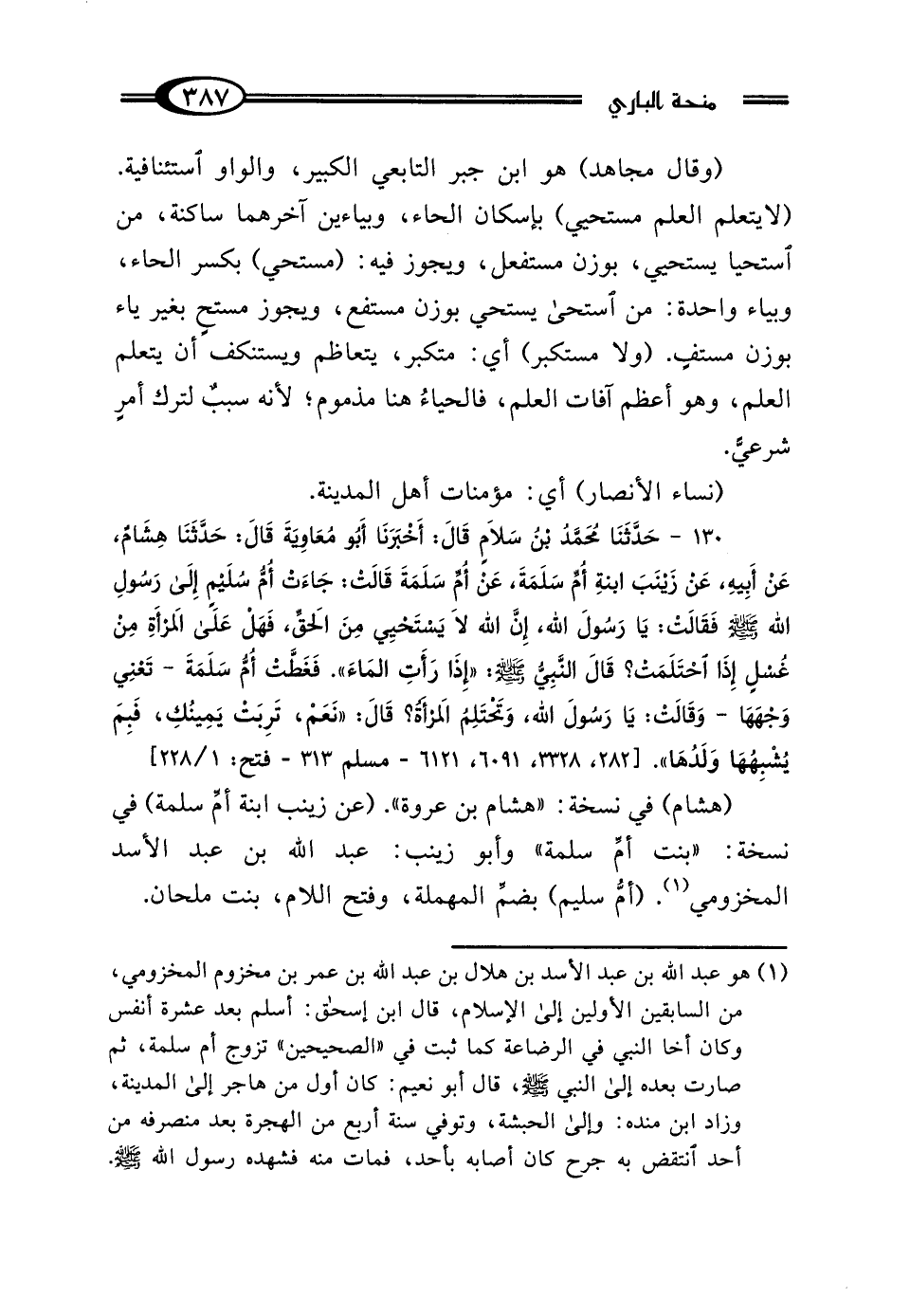 (هشام) في نسخة: "هشام بن عروة". (عن زينب ابنة أمِّ سلمة) في نسخة: "بنت أمِّ سلمة" وأبو زينب: عبد الله بن عبد الأسد المخزومي (¬1). (أمُّ سليم) بضمِّ المهملة، وفتح اللام، بنت ملحان.