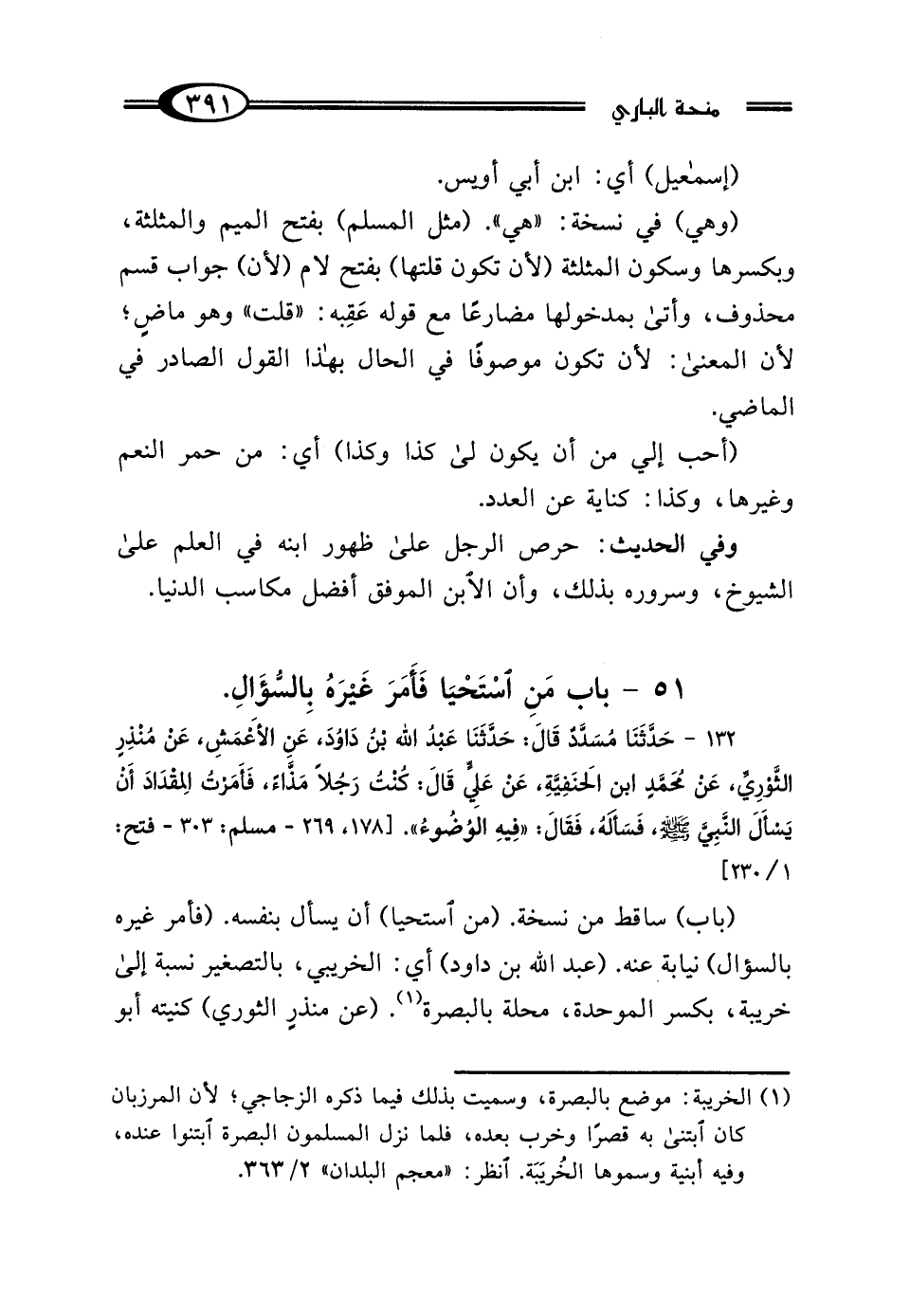 (باب) ساقط من نسخة. (من استحيا) أن يسأل بنفسه. (فأمر غيره بالسؤال) نيابة عنه. (عبد الله بن داود) أي: الخريبي، بالتصغير نسبة إلى خريبة، بكسر الموحدة، محلة بالبصرة (¬1). (عن منذرٍ الثوري) كنيته أبو