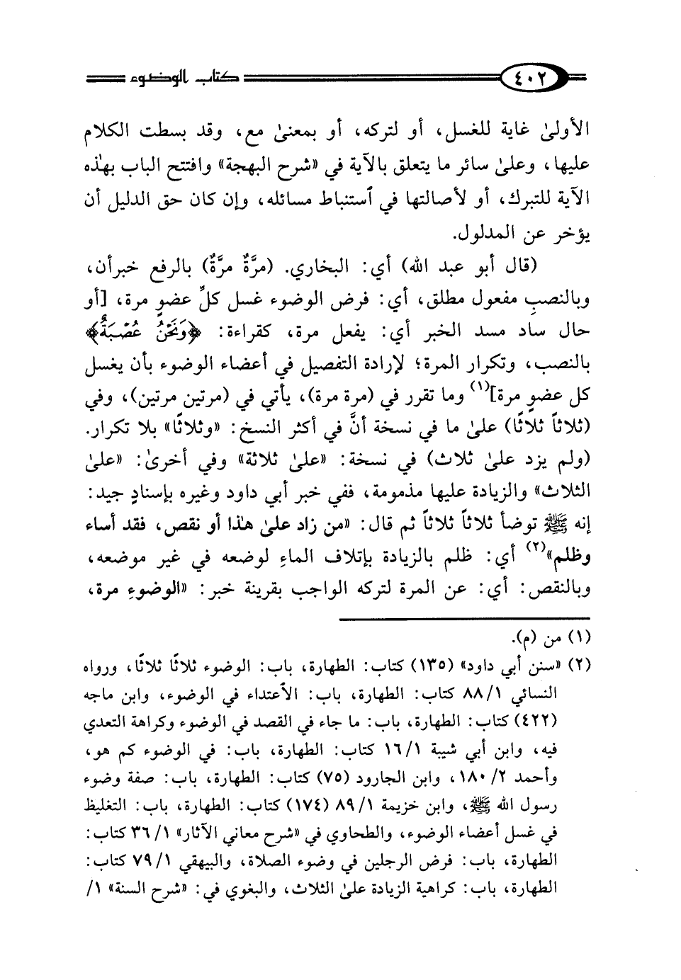 (قال أبو عبد الله) أي: البخاري. (مرَّةٌ مرَّةٌ) بالرفع خبر أن، وبالنصبِ مفعول مطلق، أي: فرض الوضوء غسل كل عضوٍ مرة، [أو حال ساد مسد الخبر أي: يفعل مرة، كقراءة: {وَنَحْنُ عُصْبَةٌ} بالنصب، وتكرار المرة؛ لإرادة التفصيل في أعضاء الوضوء بأن يغسل كل عضوٍ مرة] (¬1) وما تقرر في (مرة مرة)، يأتي في (مرتين مرتين)، وفي (ثلاثًا ثلاثًا) على ما في نسخة أنَّ في أكثر النسخ: "وثلاثًا" بلا تكرار. (ولم يزد على ثلاث) في نسخة: "على ثلاثة" وفي أخرى: "على الثلاث" والزيادة عليها مذمومة، ففي خبر أبي داود وغيره بإسنادٍ جيد: إنه - صلى الله عليه وسلم - توضأ ثلاثًا ثلاثًا ثم قال: "من زاد على هذا أو نقص، فقد أساء وظلم" (¬2) أي: ظلم بالزيادة بإتلاف الماءِ لوضعه في غير موضعه، وبالنقص: أي: عن المرة لتركه الواجب بقرينة خبر: "الوضوءِ مرة،