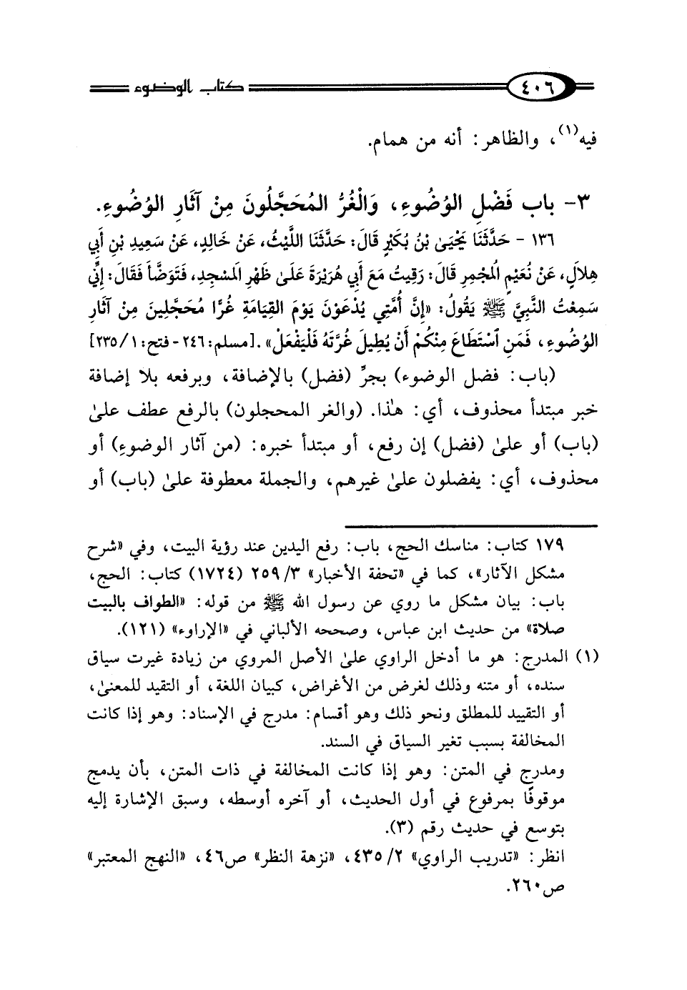 136 - حَدَّثَنَا يَحْيَى بْنُ بُكَيْرٍ، قَالَ: حَدَّثَنَا اللَّيْثُ، عَنْ خَالِدٍ، عَنْ سَعِيدِ بْنِ أَبِي هِلالٍ، عَنْ نُعَيْمٍ المُجْمِرِ، قَالَ: رَقِيتُ مَعَ أَبِي هُرَيْرَةَ عَلَى ظَهْرِ المَسْجِدِ، فَتَوَضَّأَ، فَقَالَ: إِنِّي سَمِعْتُ النَّبِيَّ صَلَّى اللهُ عَلَيْهِ وَسَلَّمَ يَقُولُ "إِنَّ أُمَّتِي يُدْعَوْنَ يَوْمَ القِيَامَةِ غُرًّا مُحَجَّلِينَ مِنْ آثَارِ الوُضُوءِ، فَمَنِ اسْتَطَاعَ مِنْكُمْ أَنْ يُطِيلَ غُرَّتَهُ فَلْيَفْعَلْ".