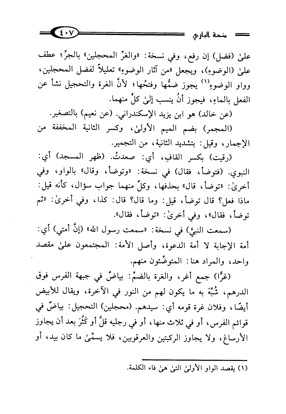 (غرًّا) جمع أغر، والغرة بالضمِّ: بياضٌ في جبهة الفرس فوق الدرهم، شُبِّه به ما يكون لهم من النور في الآخرة، ويقال للأبيض أيضًا، وفلان غرة قومه أي: سيدهم. (محجلين) التحجيل: بياضٌ في قوائم الفرس، أو في ثلاث منها، أو في رجليه قلَّ أو كَثُرَ بعد أن يجاوز الأرساغ، ولا يجاوز الركبتين والعرقوبين، فلا يسمى ما كان بيد، أو