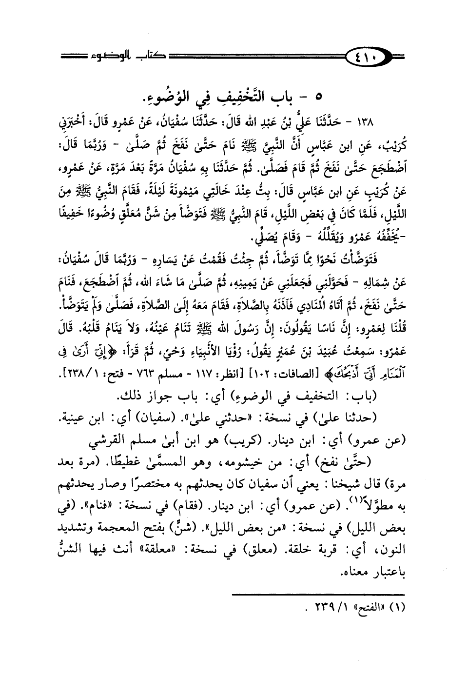 138 - حَدَّثَنَا عَلِيُّ بْنُ عَبْدِ اللَّهِ، قَالَ: حَدَّثَنَا سُفْيَانُ، عَنْ عَمْرٍو، قَالَ: أَخْبَرَنِي كُرَيْبٌ، عَنِ ابْنِ عَبَّاسٍ " أَنَّ النَّبِيَّ صلى الله عليه وسلم نَامَ حَتَّى نَفَخَ، ثُمَّ صَلَّى - وَرُبَّمَا قَالَ: اضْطَجَعَ حَتَّى نَفَخَ، ثُمَّ قَامَ فَصَلَّى - " ثُمَّ حَدَّثَنَا بِهِ سُفْيَانُ، مَرَّةً بَعْدَ مَرَّةٍ عَنْ عَمْرٍو، عَنْ كُرَيْبٍ، عَنْ ابْنِ عَبَّاسٍ، قَالَ: بِتُّ عِنْدَ خَالَتِي مَيْمُونَةَ لَيْلَةً فَقَامَ النَّبِيُّ صَلَّى اللهُ عَلَيْهِ وَسَلَّمَ مِنَ اللَّيْلِ، فَلَمَّا كَانَ فِي بَعْضِ اللَّيْلِ قَامَ النَّبِيُّ صَلَّى اللهُ عَلَيْهِ وَسَلَّمَ "فَتَوَضَّأَ مِنْ شَنٍّ مُعَلَّقٍ وُضُوءًا خَفِيفًا يُخَفِّفُهُ - عَمْرٌو وَيُقَلِّلُهُ -، وَقَامَ يُصَلِّي، فَتَوَضَّأْتُ نَحْوًا مِمَّا تَوَضَّأَ، ثُمَّ جِئْتُ فَقُمْتُ، عَنْ يَسَارِهِ - وَرُبَّمَا قَالَ سُفْيَانُ عَنْ شِمَالِهِ - فَحَوَّلَنِي فَجَعَلَنِي عَنْ يَمِينِهِ، ثُمَّ صَلَّى مَا شَاءَ اللَّهُ، ثُمَّ اضْطَجَعَ فَنَامَ حَتَّى نَفَخَ، ثُمَّ أَتَاهُ المُنَادِي فَآذَنَهُ بِالصَّلاةِ، فَقَامَ مَعَهُ إِلَى الصَّلاةِ، فَصَلَّى وَلَمْ يَتَوَضَّأْ" قُلْنَا لِعَمْرٍو إِنَّ نَاسًا يَقُولُونَ: "إِنَّ رَسُولَ اللَّهِ صَلَّى اللهُ عَلَيْهِ وَسَلَّمَ تَنَامُ عَيْنُهُ وَلَا يَنَامُ قَلْبُهُ" قَالَ عَمْرٌو سَمِعْتُ عُبَيْدَ بْنَ عُمَيْرٍ يَقُولُ: "رُؤْيَا الأَنْبِيَاءِ وَحْيٌ، ثُمَّ قَرَأَ {إِنِّي أَرَى فِي المَنَامِ أَنِّي أَذْبَحُكَ} [الصافات: 102].
