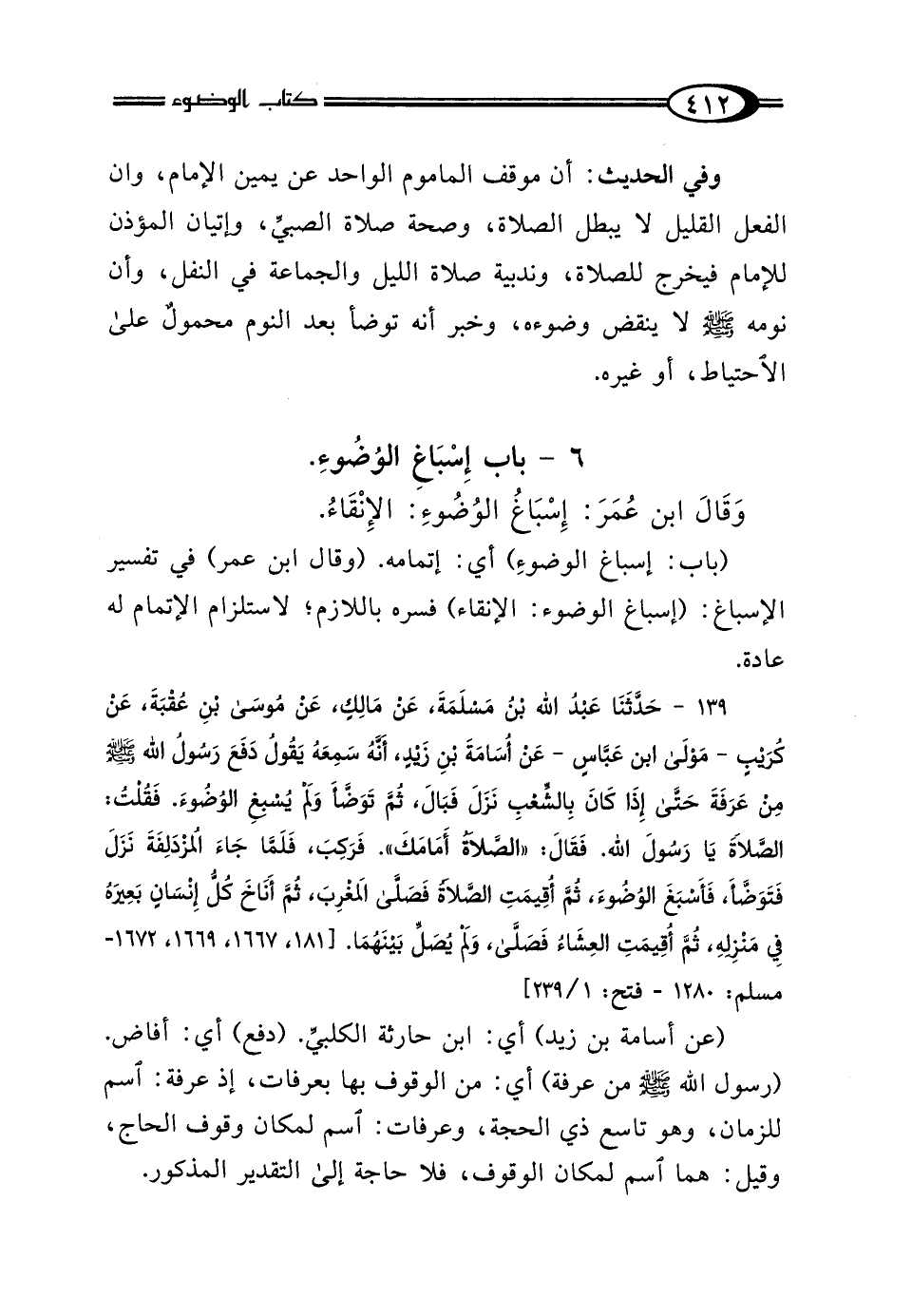 139 - حَدَّثَنَا عَبْدُ اللَّهِ بْنُ مَسْلَمَةَ، عَنْ مَالِكٍ، عَنْ مُوسَى بْنِ عُقْبَةَ، عَنْ كُرَيْبٍ، مَوْلَى ابْنِ عَبَّاسٍ عَنْ أُسَامَةَ بْنِ زَيْدٍ، أَنَّهُ سَمِعَهُ يَقُولُ: دَفَعَ رَسُولُ اللَّهِ صَلَّى اللهُ عَلَيْهِ وَسَلَّمَ مِنْ عَرَفَةَ حَتَّى إِذَا كَانَ بِالشِّعْبِ نَزَلَ فَبَالَ، ثُمَّ تَوَضَّأَ وَلَمْ يُسْبِغِ الوُضُوءَ فَقُلْتُ الصَّلاةَ يَا رَسُولَ اللَّهِ، فَقَالَ: "الصَّلاةُ أَمَامَكَ" فَرَكِبَ، فَلَمَّا جَاءَ المُزْدَلِفَةَ نَزَلَ فَتَوَضَّأَ، فَأَسْبَغَ الوُضُوءَ، ثُمَّ أُقِيمَتِ الصَّلاةُ، فَصَلَّى المَغْرِبَ ثُمَّ أَنَاخَ كُلُّ إِنْسَانٍ بَعِيرَهُ فِي مَنْزِلِهِ، ثُمَّ أُقِيمَتِ العِشَاءُ فَصَلَّى، وَلَمْ يُصَلِّ بَيْنَهُمَا.