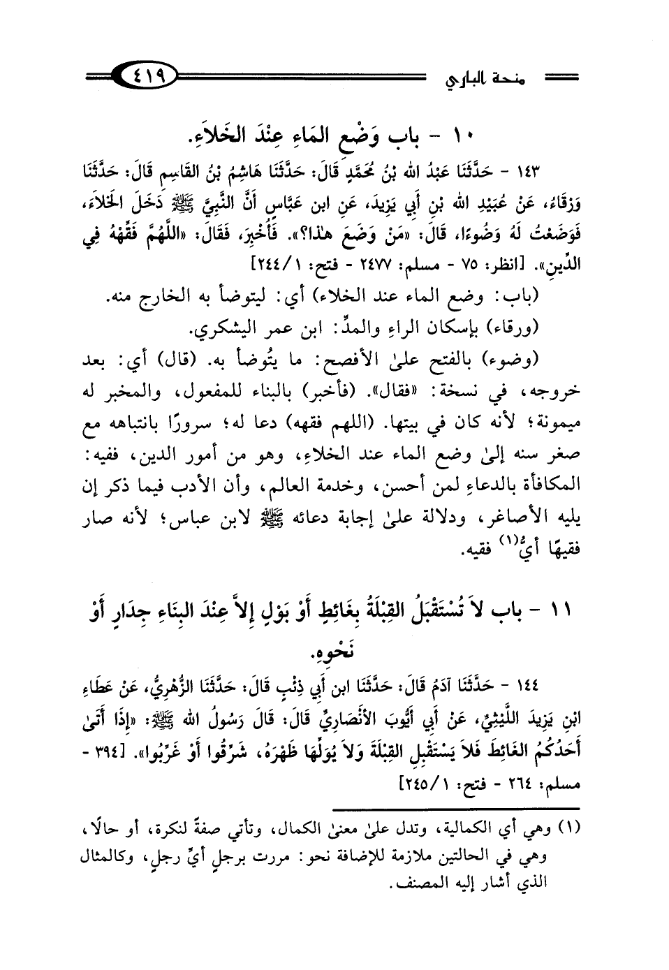 143 - حَدَّثَنَا عَبْدُ اللَّهِ بْنُ مُحَمَّدٍ قَالَ: حَدَّثَنَا هَاشِمُ بْنُ القَاسِمِ، قَالَ: حَدَّثَنَا وَرْقَاءُ، عَنْ عُبَيْدِ اللَّهِ بْنِ أَبِي يَزِيدَ، عَنِ ابْنِ عَبَّاسٍ أَنَّ النَّبِيَّ صَلَّى اللهُ عَلَيْهِ وَسَلَّمَ دَخَلَ الخَلاءَ، فَوَضَعْتُ لَهُ وَضُوءًا قَالَ: "مَنْ وَضَعَ هَذَا فَأُخْبِرَ فَقَالَ اللَّهُمَّ فَقِّهْهُ فِي الدِّينِ".