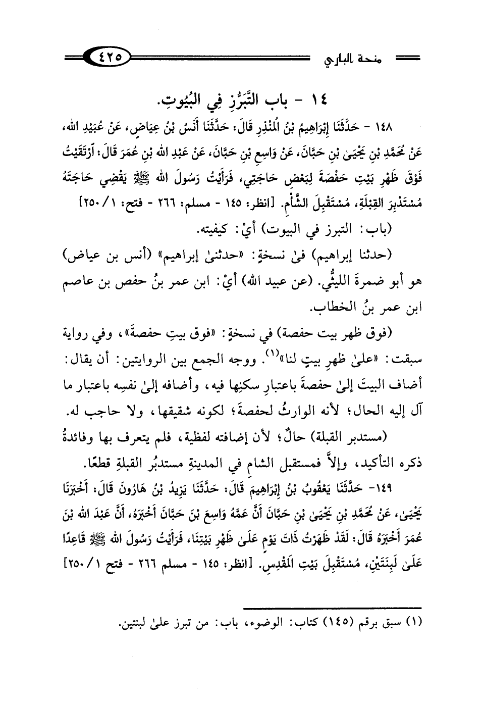 148 - حَدَّثَنَا إِبْرَاهِيمُ بْنُ المُنْذِرِ، قَالَ: حَدَّثَنَا أَنَسُ بْنُ عِيَاضٍ، عَنْ عُبَيْدِ اللَّهِ، عَنْ مُحَمَّدِ بْنِ يَحْيَى بْنِ حَبَّانَ، عَنْ وَاسِعِ بْنِ حَبَّانَ، عَنْ عَبْدِ اللَّهِ بْنِ عُمَرَ، قَالَ: ارْتَقَيْتُ فَوْقَ ظَهْرِ بَيْتِ حَفْصَةَ لِبَعْضِ حَاجَتِي، فَرَأَيْتُ رَسُولَ اللَّهِ صَلَّى اللهُ عَلَيْهِ وَسَلَّمَ يَقْضِي حَاجَتَهُ مُسْتَدْبِرَ القِبْلَةِ، مُسْتَقْبِلَ الشَّأْمِ.