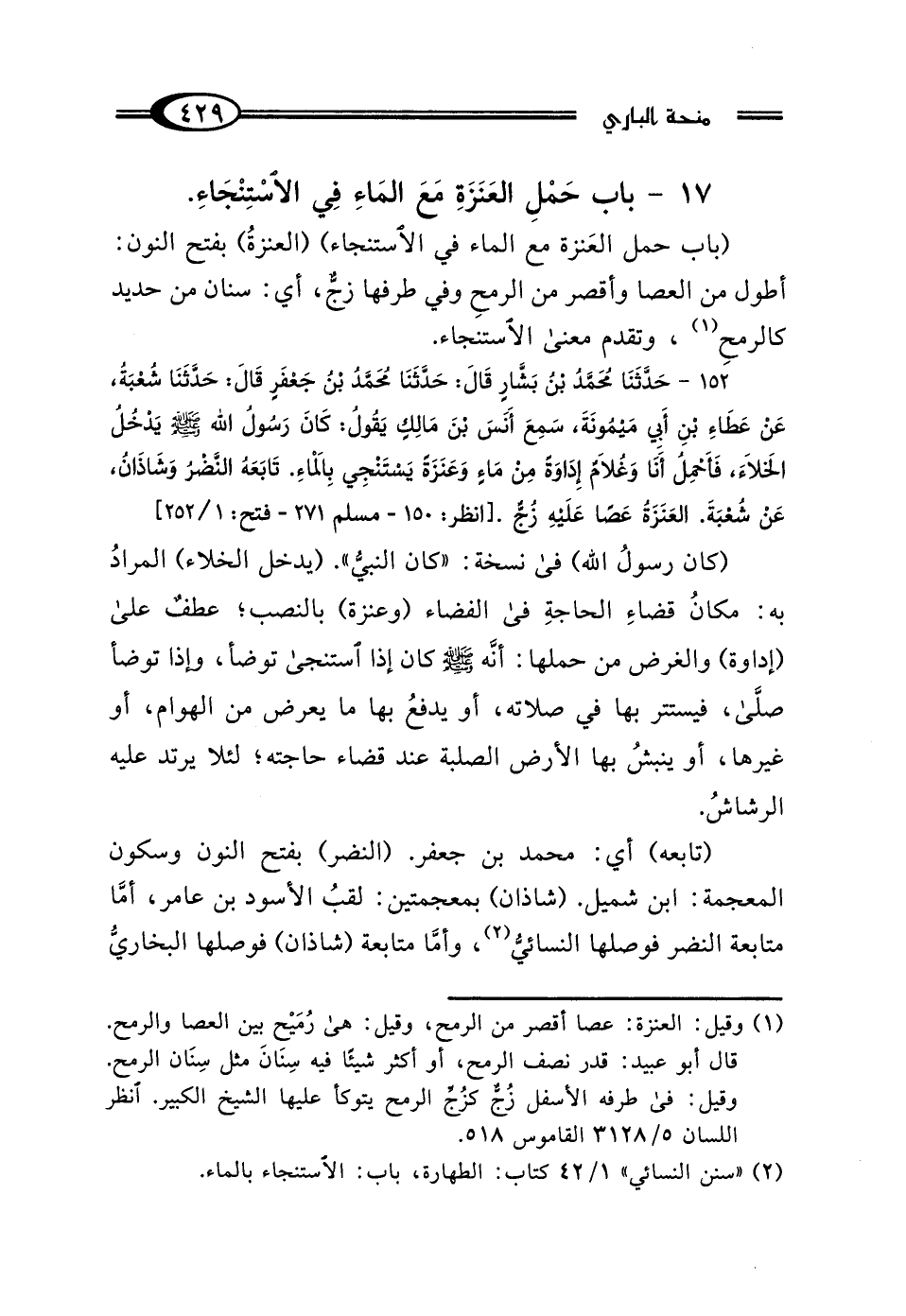 152 - حَدَّثَنَا مُحَمَّدُ بْنُ بَشَّارٍ، قَالَ: حَدَّثَنَا مُحَمَّدُ بْنُ جَعْفَرٍ، قَالَ: حَدَّثَنَا شُعْبَةُ، عَنْ عَطَاءِ بْنِ أَبِي مَيْمُونَةَ، سَمِعَ أَنَسَ بْنَ مَالِكٍ، يَقُولُ كَانَ رَسُولُ اللَّهِ صَلَّى اللهُ عَلَيْهِ وَسَلَّمَ "يَدْخُلُ الخَلاءَ، فَأَحْمِلُ أَنَا وَغُلامٌ إِدَاوَةً مِنْ مَاءٍ وَعَنَزَةً، يَسْتَنْجِي بِالْمَاءِ" تَابَعَهُ النَّضْرُ وَشَاذَانُ، عَنْ شُعْبَةَ العَنَزَةُ: عَصًا عَلَيْهِ زُجٌّ.
