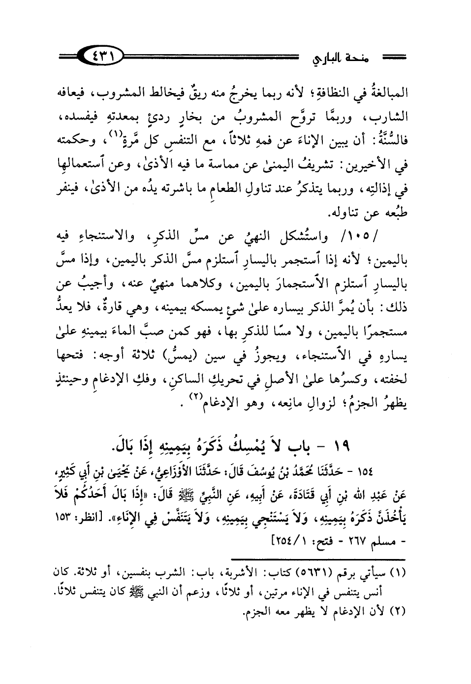 واستُشكل النهيُ عن مسّ الذكرِ، والاستنجاءِ فيه باليمين؛ لأنه إذا استجمر باليسارِ استلزم مسَّ الذكر باليمين، وإذا مسَّ باليسارِ استلزم الاستجمارَ باليمين، وكلاهما منهي عنه، وأجيبُ عن ذلك: بأن يُمرَّ الذكر بيساره على شيءٍ يمسكه بيمينه، وهي قارة، فلا يعدّ مستجمرًا باليمين، ولا مسا للذكرِ بها، فهو كمن صبَّ الماءَ بيمينهِ على يسارهِ في الاستنجاء، ويجوزُ في سين (يمسُّ) ثلاثة أوجه: فتحها لخفته، وكسرُها على الأصلِ في تحريكِ الساكنِ، وفكِ الإدغامِ وحينئذٍ يظهرُ الجزمُ، لزوالِ مانِعه، وهو الإدغام (¬2).