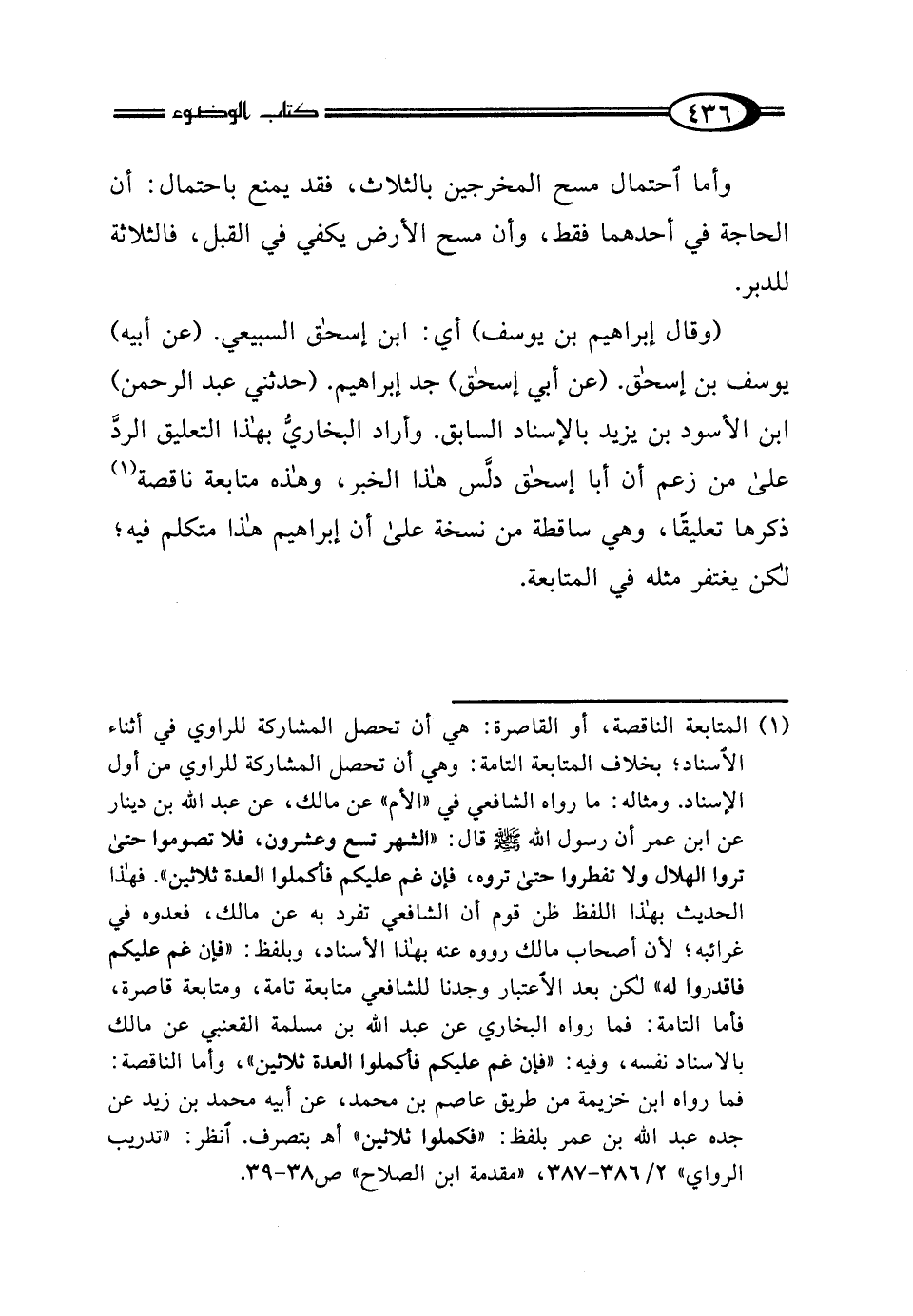 (¬1) المتابعة الناقصة، أو القاصرة: هي أن تحصل المشاركة للراوي في أثناء الإسناد؛ بخلاف المتابعة التامة: وهي أن تحصل المشاركة للراوي من أول الإسناد. ومثاله: ما رواه الشافعي في "الأم" عن مالك، عن عبد الله بن دينار عن ابن عمر أن رسول الله - صلى الله عليه وسلم - قال: "الشهر تسع وعشرون، فلا تصوموا حتى تروا الهلال ولا تفطروا حتى تروه، فإن غم عليكم فأكملوا العدة ثلاثين". فهذا الحديث بهذا اللفظ ظن قوم أن الشافعي تفرد به عن مالك، فعدوه في غرائبه؛ لأن أصحاب مالك رووه عنه بهذا الإسناد، وبلفظ: "فإن غم عليكم فاقدروا له" لكن بعد الاعتبار وجدنا للشافعي متابعة تامة، ومتابعة قاصرة، فأما التامة: فما رواه البخاري عن عبد الله بن مسلمة القعنبي عن مالك بالإسناد نفسه، وفيه: "فإن غم عليكم فأكملوا العدة ثلاثين"، وأما الناقصة: فما رواه ابن خزيمة من طريق عاصم بن محمد، عن أبيه محمد بن زيد عن جده عبد الله بن عمر بلفظ: "فأكملوا ثلاثين" أهـ بتصرف. انظر: "تدريب الرواي" 2/ 386 - 387، "مقدمة ابن الصلاح" صـ 38 - 39.