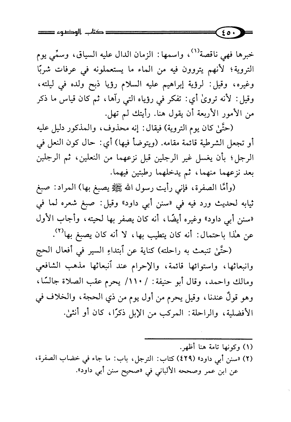 (حتَّى كان يوم التروية) فيقال: إنه محذوف، والمذكور دليل عليه أو تجعل الشرطية قائمة مقامه. (ويتوضأ فيها) أي: حال كون النعل في الرجل؛ بأن يغسل غير الرجلين قبل نزعهما من النعلين، ثم الرجلين بعد نزعهما منهما، ثم يدخلهما رطبتين فيهما.