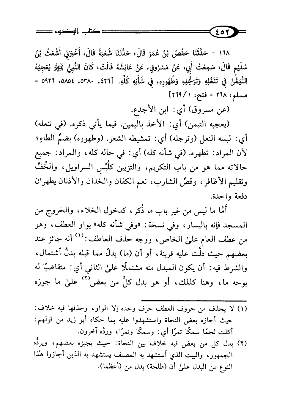 168 - حَدَّثَنَا حَفْصُ بْنُ عُمَرَ، قَالَ: حَدَّثَنَا شُعْبَةُ، قَالَ: أَخْبَرَنِي أَشْعَثُ بْنُ سُلَيْمٍ، قَالَ: سَمِعْتُ أَبِي، عَنْ مَسْرُوقٍ، عَنْ عَائِشَةَ، قَالَتْ: كَانَ النَّبِيُّ صَلَّى اللهُ عَلَيْهِ وَسَلَّمَ "يُعْجِبُهُ التَّيَمُّنُ، فِي تَنَعُّلِهِ، وَتَرَجُّلِهِ، وَطُهُورِهِ، وَفِي شَأْنِهِ كُلِّهِ".