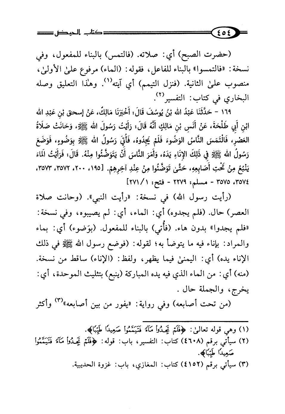 (حضرت الصبح) أي: صلاته. (فالتمس) بالبناء للمفعول، وفي نسخة: "فالتمسوا" بالبناء للفاعل، فقوله: (الماء) مرفوع على الأولى، منصوب على الثانية. (فنزل التيمم) أي آيته (¬1). وهذا التعليق وصله البخاري في كتاب: التفسير (¬2).